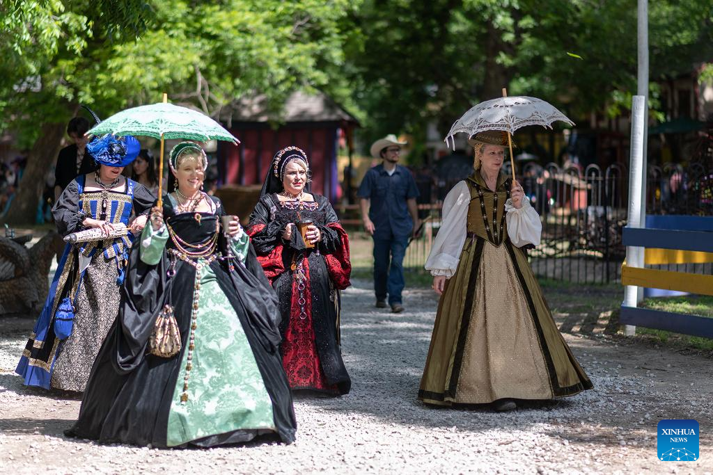 Women in 16-century costumes show up in a parade at the Scarborough Renaissance Festival in Waxahachie, on the outskirts of Dallas, Texas, the United States on May 18, 2024. (Photo by Lin Li/Xinhua)