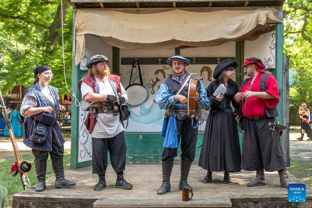 Actors sing pirate songs at the Scarborough Renaissance Festival in Waxahachie, on the outskirts of Dallas, Texas, the United States on May 18, 2024. (Photo by Lin Li/Xinhua)