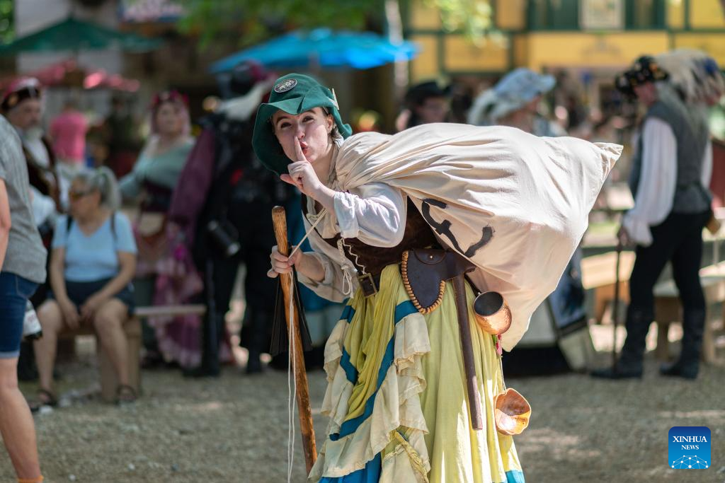 A woman in 16-century costumes is pictured at the Scarborough Renaissance Festival in Waxahachie, on the outskirts of Dallas, Texas, the United States on May 18, 2024. (Photo by Lin Li/Xinhua)