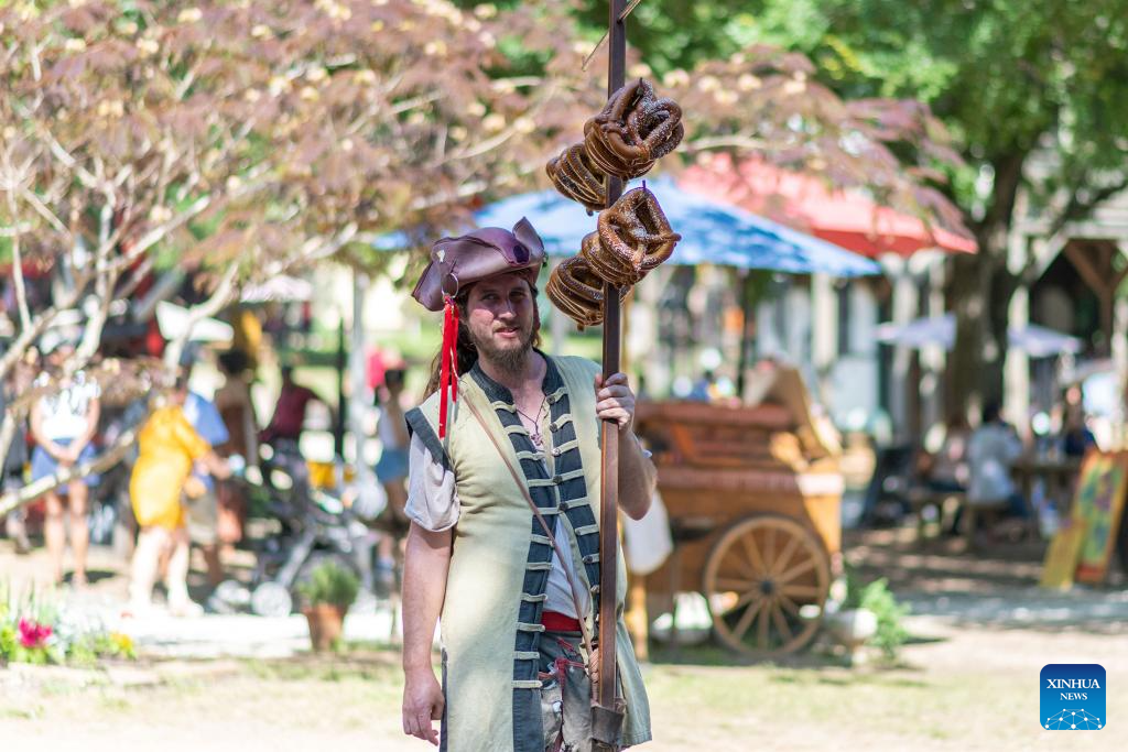 A young man in 16-century costume sells pretzels at the Scarborough Renaissance Festival in Waxahachie, on the outskirts of Dallas, Texas, the United States on May 18, 2024. (Photo by Lin Li/Xinhua)