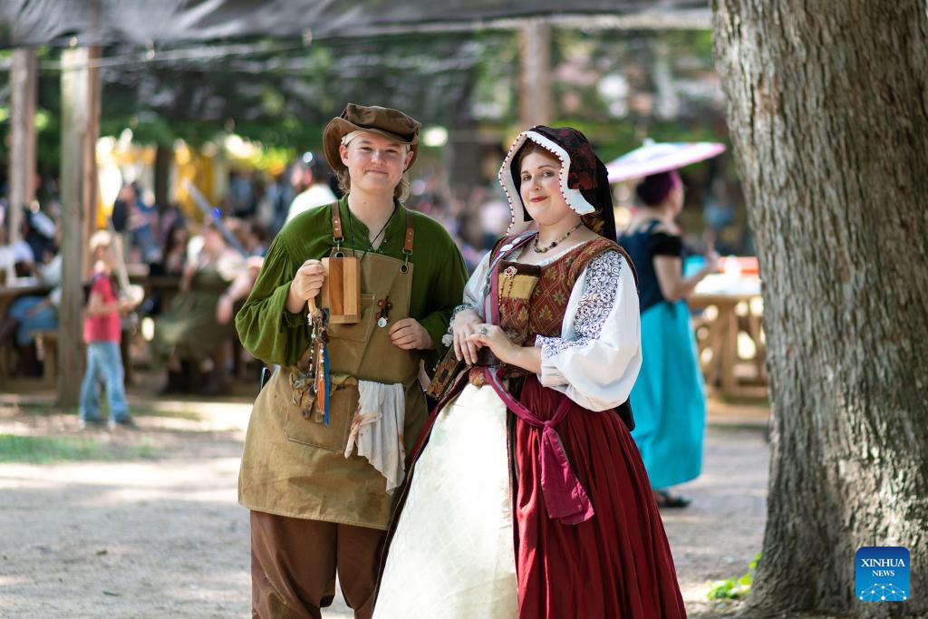 Women in 16-century costumes are seen at the Scarborough Renaissance Festival in Waxahachie, on the outskirts of Dallas, Texas, the United States on May 18, 2024. (Photo by Lin Li/Xinhua)