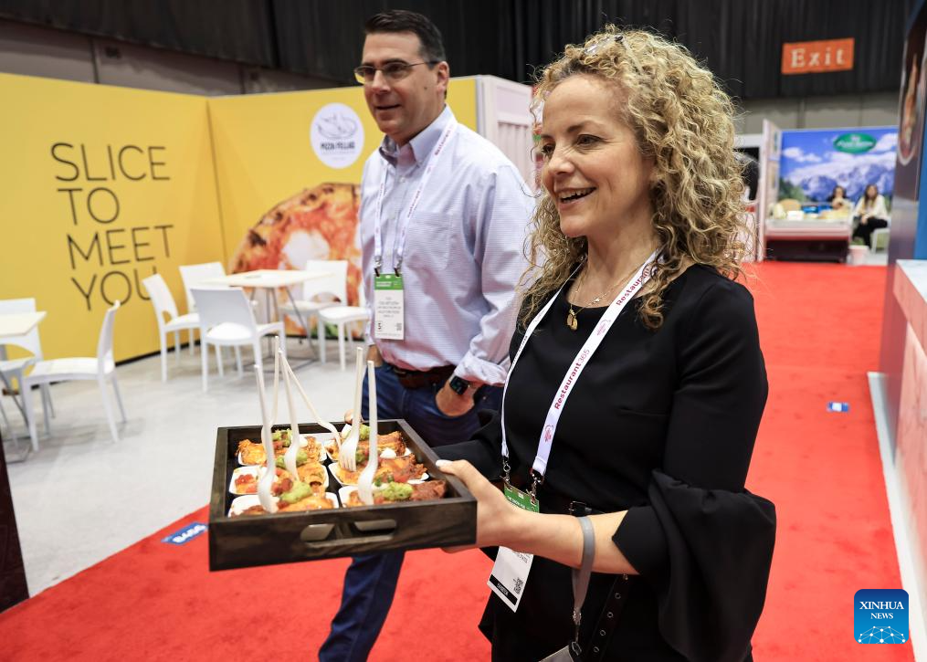 A representative offers food samples during the 2024 National Restaurant Association Show at McCormick Place in Chicago, U.S. state of Illinois, on May 19, 2024. More than 2,240 exhibitors participated in the show. (Photo by Joel Lerner/Xinhua)