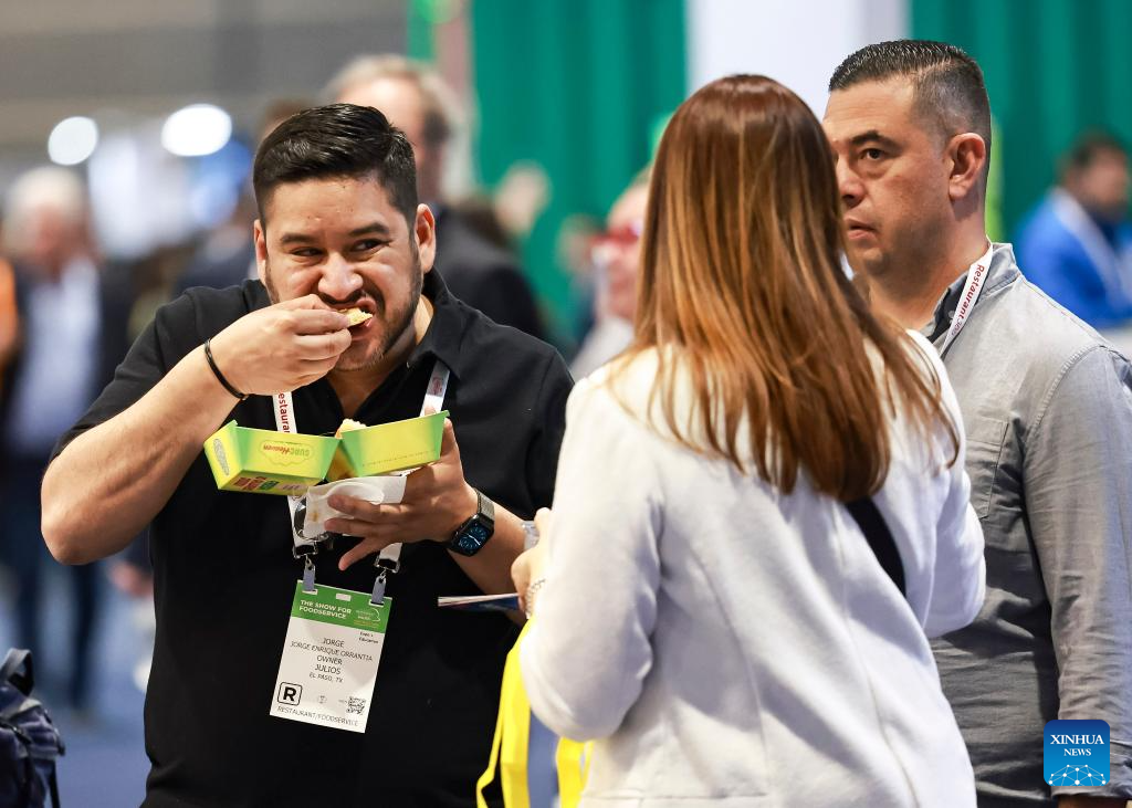 An attendee samples some food during the 2024 National Restaurant Association Show at McCormick Place in Chicago, U.S. state of Illinois, on May 19, 2024. More than 2,240 exhibitors participated in the show. (Photo by Joel Lerner/Xinhua)