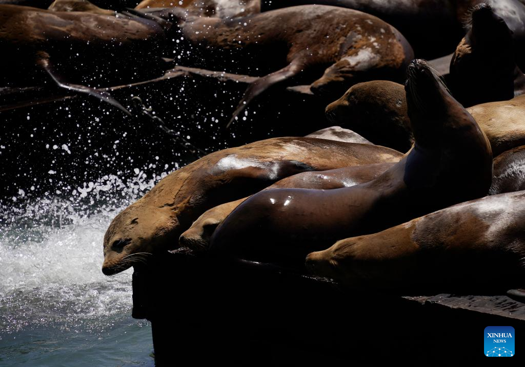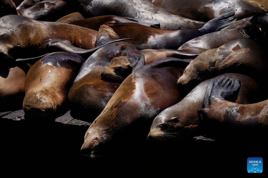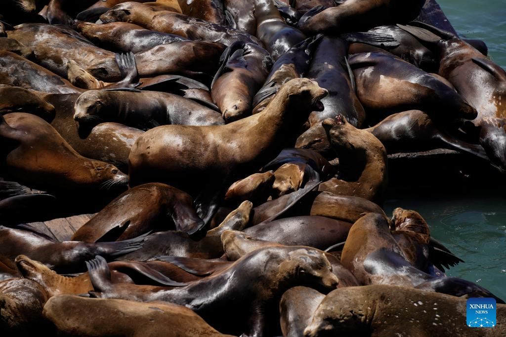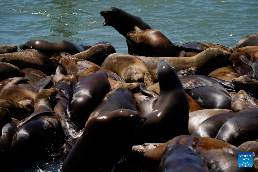 Sea lions sunbathe on a raft at Pier 39 in San Francisco, California, the United States, May 23, 2024. (Photo by Li Jianguo/Xinhua)