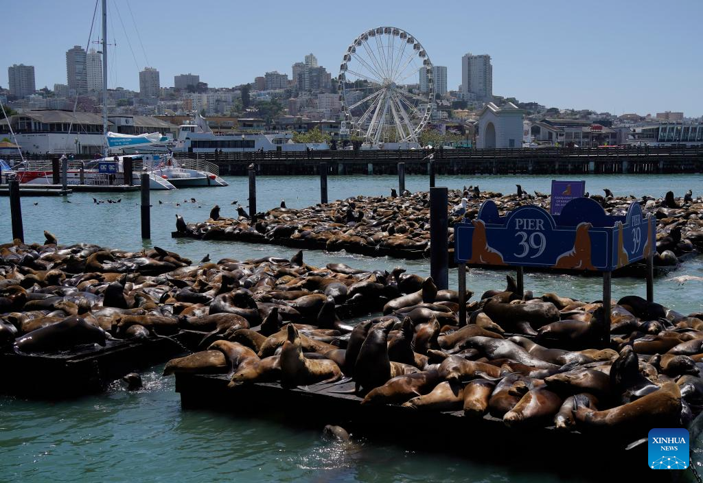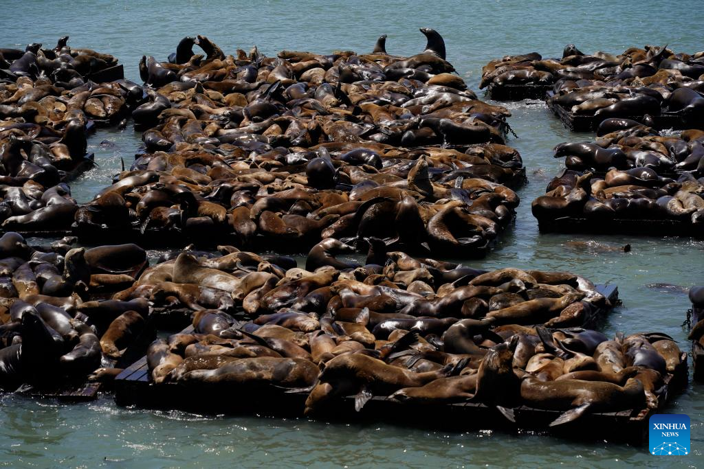 Sea lions sunbathe on rafts at Pier 39 in San Francisco, California, the United States, May 23, 2024. (Photo by Li Jianguo/Xinhua)