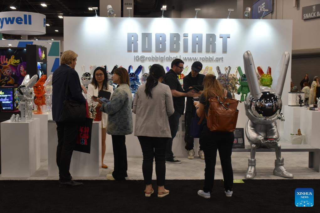 People visit the exhibition area of Chinese company ROBBiART at Licensing Expo 2024 in Las Vegas, the United States, on May 22, 2024. Chinese brands are participating in the world's leading licensing expo this week in Las Vegas, exploring opportunities to expand overseas markets and build up influence of Chinese intellectual property (IP) in the global licensing industry. (Photo by Zeng Hui/Xinhua)