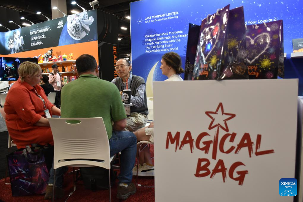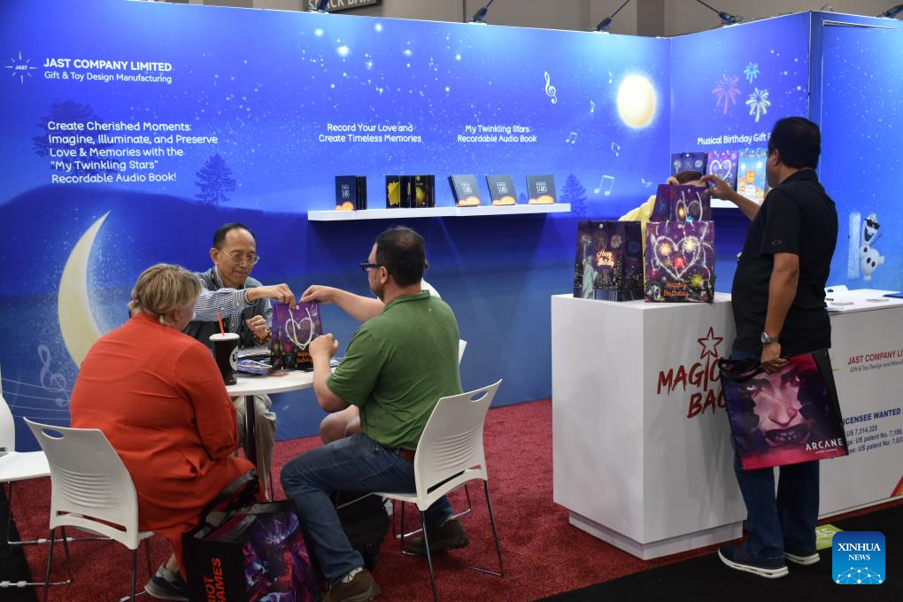 People visit the exhibition area of Chinese company JAST Company Limited at Licensing Expo 2024 in Las Vegas, the United States, on May 22, 2024. Chinese brands are participating in the world's leading licensing expo this week in Las Vegas, exploring opportunities to expand overseas markets and build up influence of Chinese intellectual property (IP) in the global licensing industry. (Photo by Zeng Hui/Xinhua)
