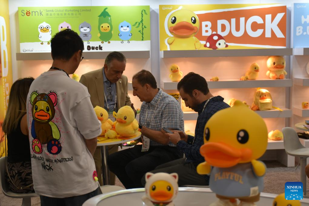 People visit the exhibition area of Chinese brand B. Duck at Licensing Expo 2024 in Las Vegas, the United States, on May 22, 2024. Chinese brands are participating in the world's leading licensing expo this week in Las Vegas, exploring opportunities to expand overseas markets and build up influence of Chinese intellectual property (IP) in the global licensing industry. (Photo by Zeng Hui/Xinhua)