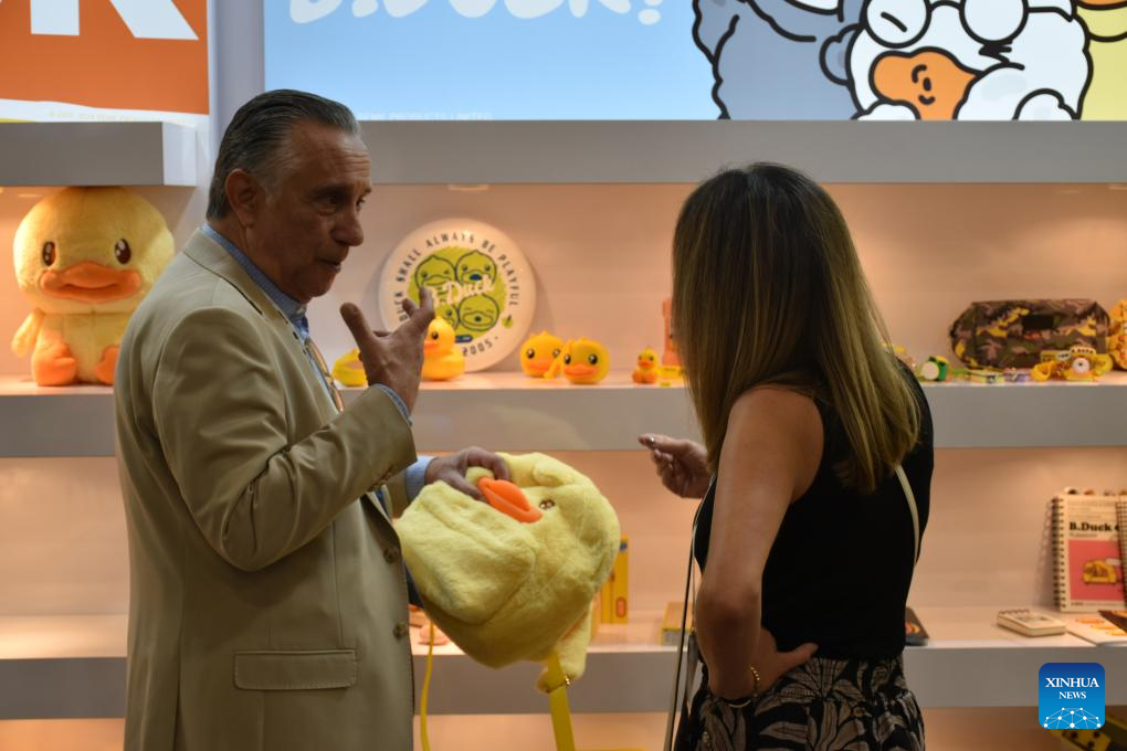 People talk in the exhibition area of Chinese brand B. Duck at Licensing Expo 2024 in Las Vegas, the United States, on May 22, 2024. Chinese brands are participating in the world's leading licensing expo this week in Las Vegas, exploring opportunities to expand overseas markets and build up influence of Chinese intellectual property (IP) in the global licensing industry. (Photo by Zeng Hui/Xinhua)