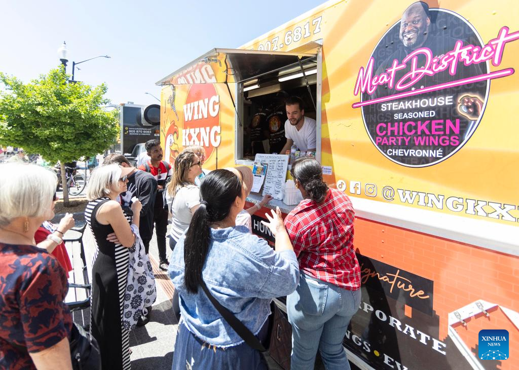 People line up for meals at the Food Truck Friday, an event to raise awareness and inclusion for people with developmental disabilities, in Oakville, Ontario, Canada, on May 31, 2024. (Photo by Zou Zheng/Xinhua)