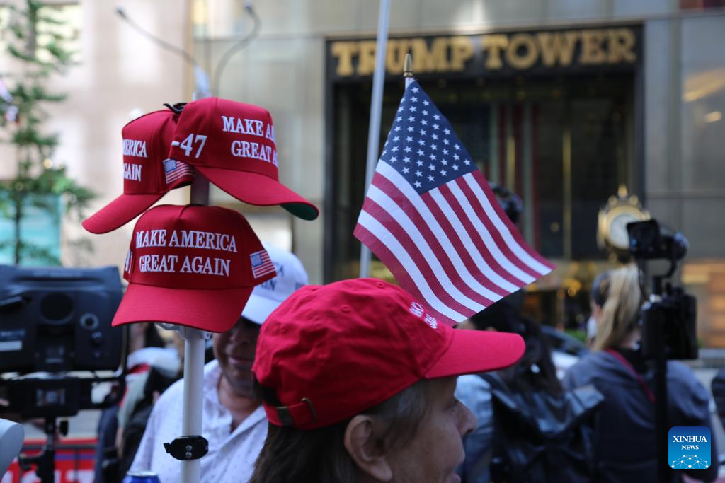 People wearing caps in support of former U.S. President Donald Trump are seen in front of Trump Tower in New York, the United States, on May 31, 2024. Former U.S. President Donald Trump Friday said he will appeal his conviction on all counts in the hush money trial in New York City. (Xinhua/Liu Yanan)