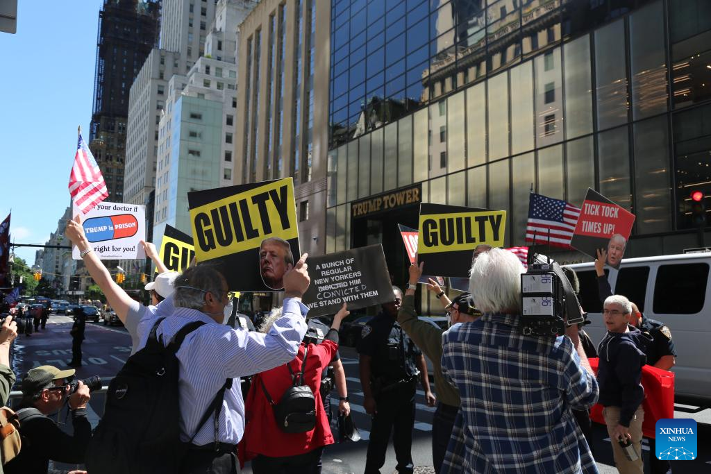 Demonstrators hold signs in support of former U.S. President Donald Trump's conviction outside Trump Tower in New York, the United States, on May 31, 2024. Former U.S. President Donald Trump Friday said he will appeal his conviction on all counts in the hush money trial in New York City. (Xinhua/Liu Yanan)