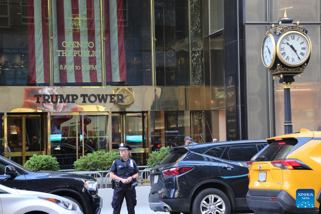 A police officer stands guard in front of Trump Tower in New York, the United States, on May 31, 2024. Former U.S. President Donald Trump Friday said he will appeal his conviction on all counts in the hush money trial in New York City. (Xinhua/Liu Yanan)