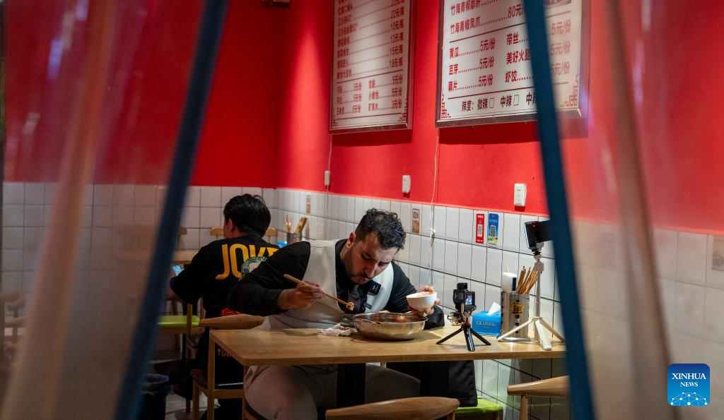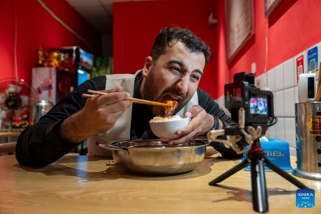 Iraqi food vlogger Ahmed Mohammed Jaber enjoys food at a local restaurant in Chengdu, southwest China's Sichuan Province, May 28, 2024. Dressed in a smart suit, Ahmed Mohammed Jaber talks to the camera in Mandarin with an accent, commencing his latest food tasting vlog. Ahmed, also known by the Chinese name Wang Lixuan, hails from Iraq though it is the food vlogger's tenth year in China. (Xinhua/Xue Chen)