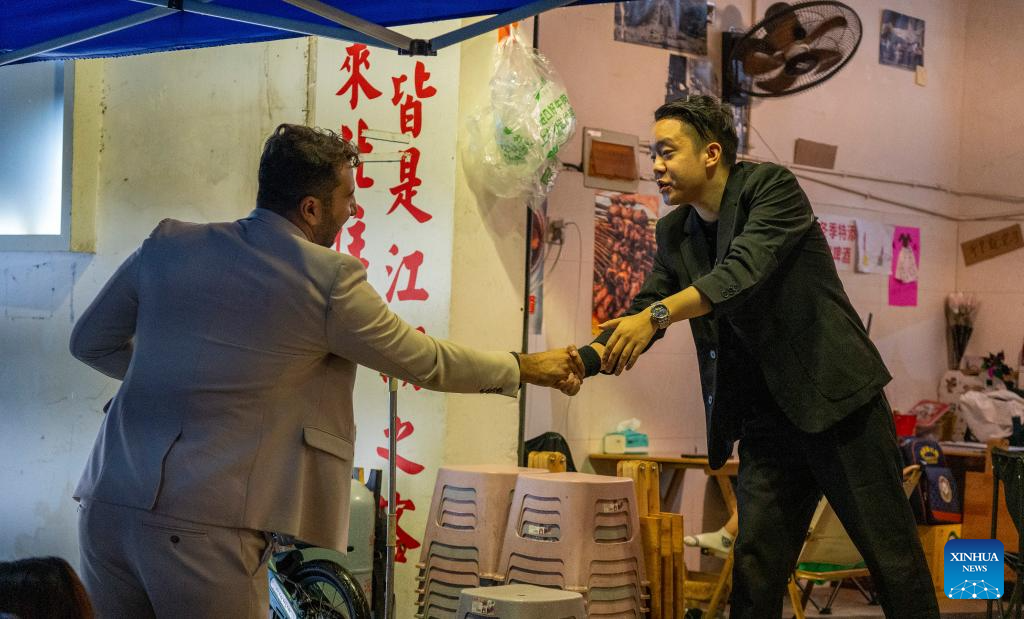 Iraqi food vlogger Ahmed Mohammed Jaber (L) shakes hands with a fan in Chengdu, southwest China's Sichuan Province, May 28, 2024. Dressed in a smart suit, Ahmed Mohammed Jaber talks to the camera in Mandarin with an accent, commencing his latest food tasting vlog. Ahmed, also known by the Chinese name Wang Lixuan, hails from Iraq though it is the food vlogger's tenth year in China.(Xinhua/Xue Chen)