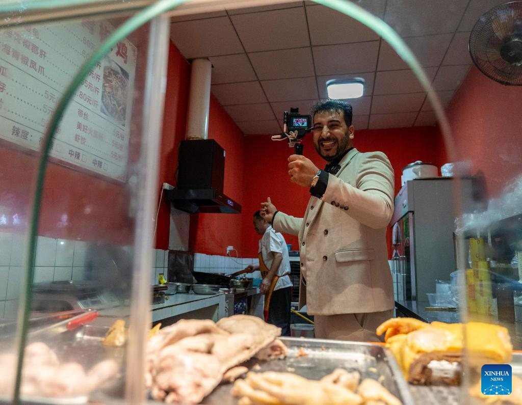 Iraqi food vlogger Ahmed Mohammed Jaber records a video in the kitchen of a local restaurant in Chengdu, southwest China's Sichuan Province, May 28, 2024. Dressed in a smart suit, Ahmed Mohammed Jaber talks to the camera in Mandarin with an accent, commencing his latest food tasting vlog. Ahmed, also known by the Chinese name Wang Lixuan, hails from Iraq though it is the food vlogger's tenth year in China. (Xinhua/Xue Chen)