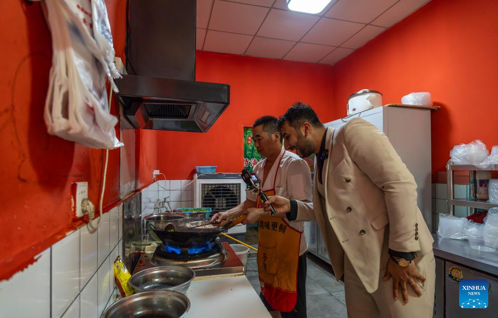 Iraqi food vlogger Ahmed Mohammed Jaber records a video in the kitchen of a local restaurant in Chengdu, southwest China's Sichuan Province, May 28, 2024. Dressed in a smart suit, Ahmed Mohammed Jaber talks to the camera in Mandarin with an accent, commencing his latest food tasting vlog. Ahmed, also known by the Chinese name Wang Lixuan, hails from Iraq though it is the food vlogger's tenth year in China.(Xinhua/Xue Chen)