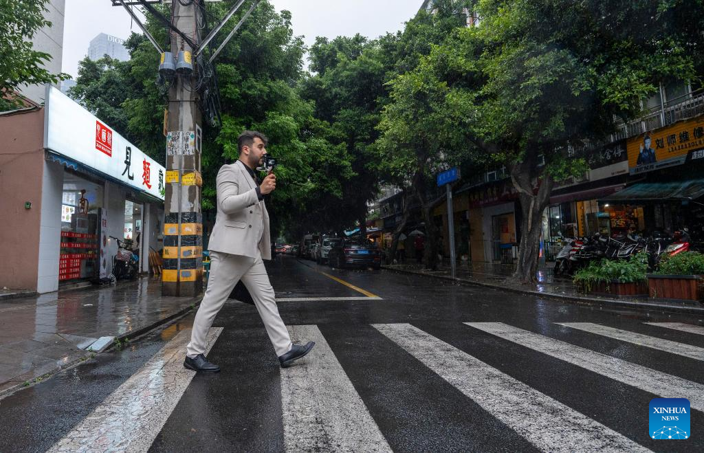 Iraqi food vlogger Ahmed Mohammed Jaber records a video in Chengdu, southwest China's Sichuan Province, May 28, 2024. Dressed in a smart suit, Ahmed Mohammed Jaber talks to the camera in Mandarin with an accent, commencing his latest food tasting vlog. Ahmed, also known by the Chinese name Wang Lixuan, hails from Iraq though it is the food vlogger's tenth year in China.(Xinhua/Xue Chen)
