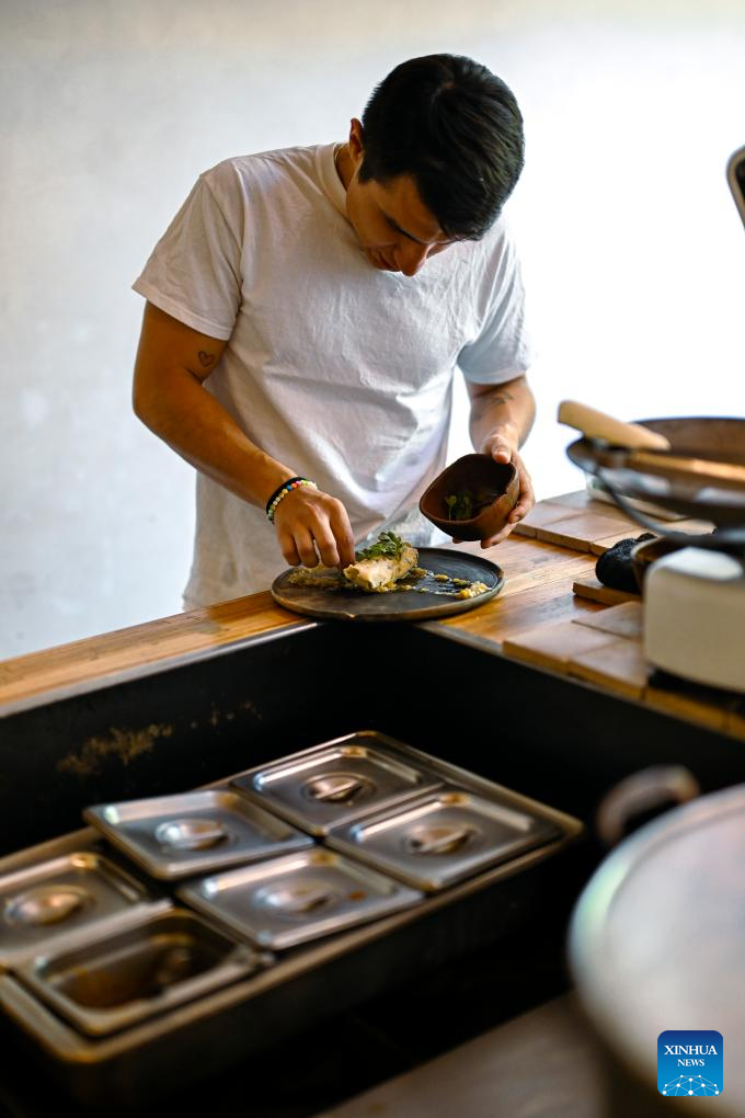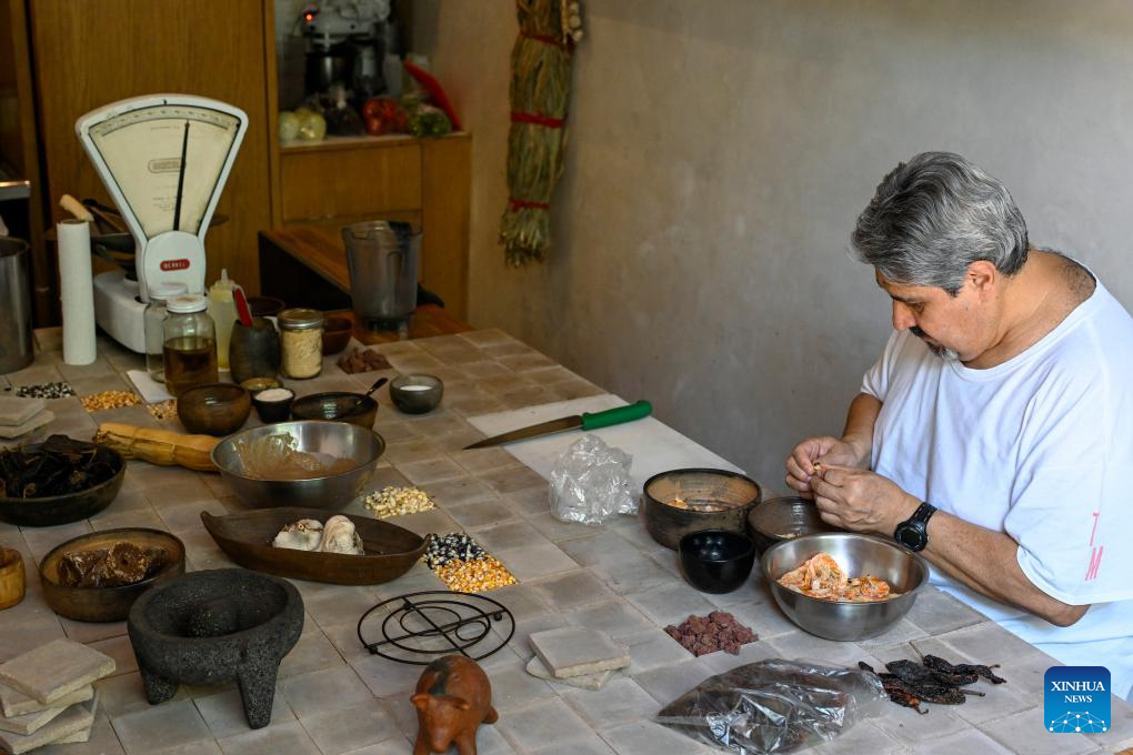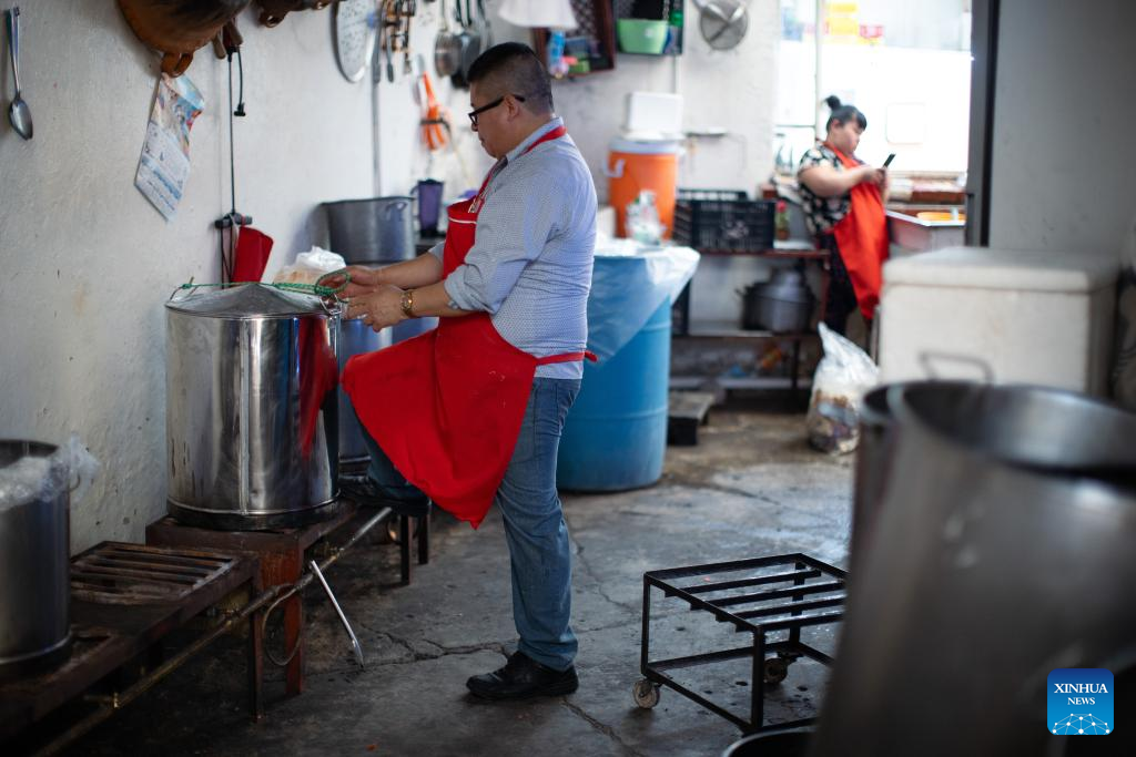 Ruben Amador Reyes, master chef of Tamales Madre restaurant, prepares the tamales sauce in Mexico City, Mexico, June 8, 2024. Tamales is a popular delicacy in Mexico. Like many other food in Mexico, the tamales traces its origins to hundreds of years ago, well before the arrival of the Spanish. Mexico's indigenous communities relished this dietary staple, made of cornmeal stuffed with meats and sauces, wrapped and steamed in corn husks or banana leaves. (Xinhua/Li Muzi)