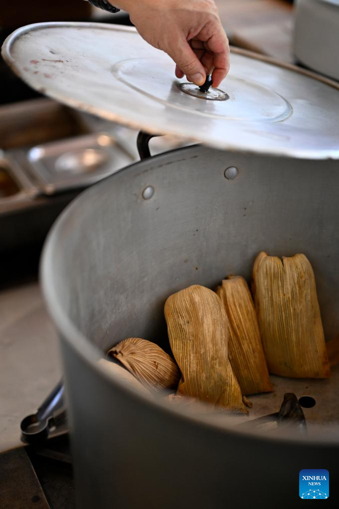 Chef Quirino Tolentino Castro prepares to steam Tamales Oaxaquenos at Tamales Tata restaurant in Mexico City, Mexico, June 6, 2024. Tamales is a popular delicacy in Mexico. Like many other food in Mexico, the tamales traces its origins to hundreds of years ago, well before the arrival of the Spanish. Mexico's indigenous communities relished this dietary staple, made of cornmeal stuffed with meats and sauces, wrapped and steamed in corn husks or banana leaves. (Xinhua/Li Muzi)