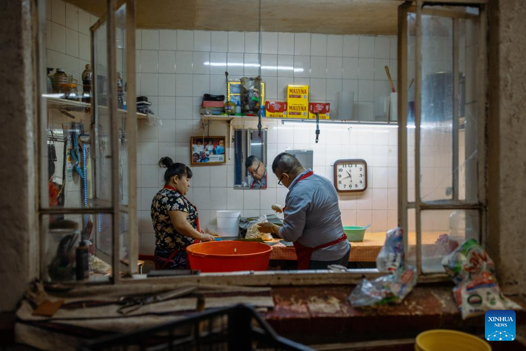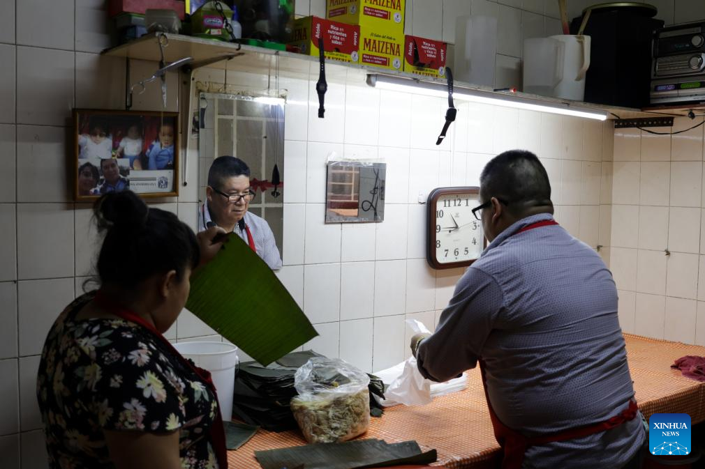 A restaurant staff prepares tamales at Tamales Madre restaurant in Mexico City, Mexico, June 8, 2024. Tamales is a popular delicacy in Mexico. Like many other food in Mexico, the tamales traces its origins to hundreds of years ago, well before the arrival of the Spanish. Mexico's indigenous communities relished this dietary staple, made of cornmeal stuffed with meats and sauces, wrapped and steamed in corn husks or banana leaves. (Xinhua/Li Muzi)