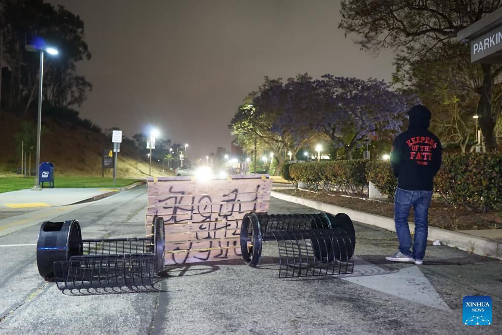 A pro-Palestinian protester sets up barricades in front of the Student Services Building with large furniture, office electronics and equipment at California State University, Los Angeles (Cal State LA), in Los Angeles, California, the United States, on June 13, 2024. A group of pro-Palestinian protesters took over the university's student services building, which includes the office of the university's president, on Wednesday afternoon. Some school administrators were reportedly trapped inside the building after the university urged employees to shelter in place. (Xinhua)