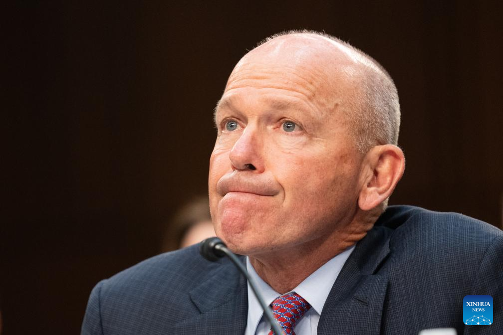 Boeing President and CEO Dave Calhoun testifies during a Senate Committee on Homeland Security and Governmental Affairs hearing titled "Boeing's Broken Safety Culture" in Washington, D.C., the United States, on June 18, 2024. (Xinhua/Liu Jie)