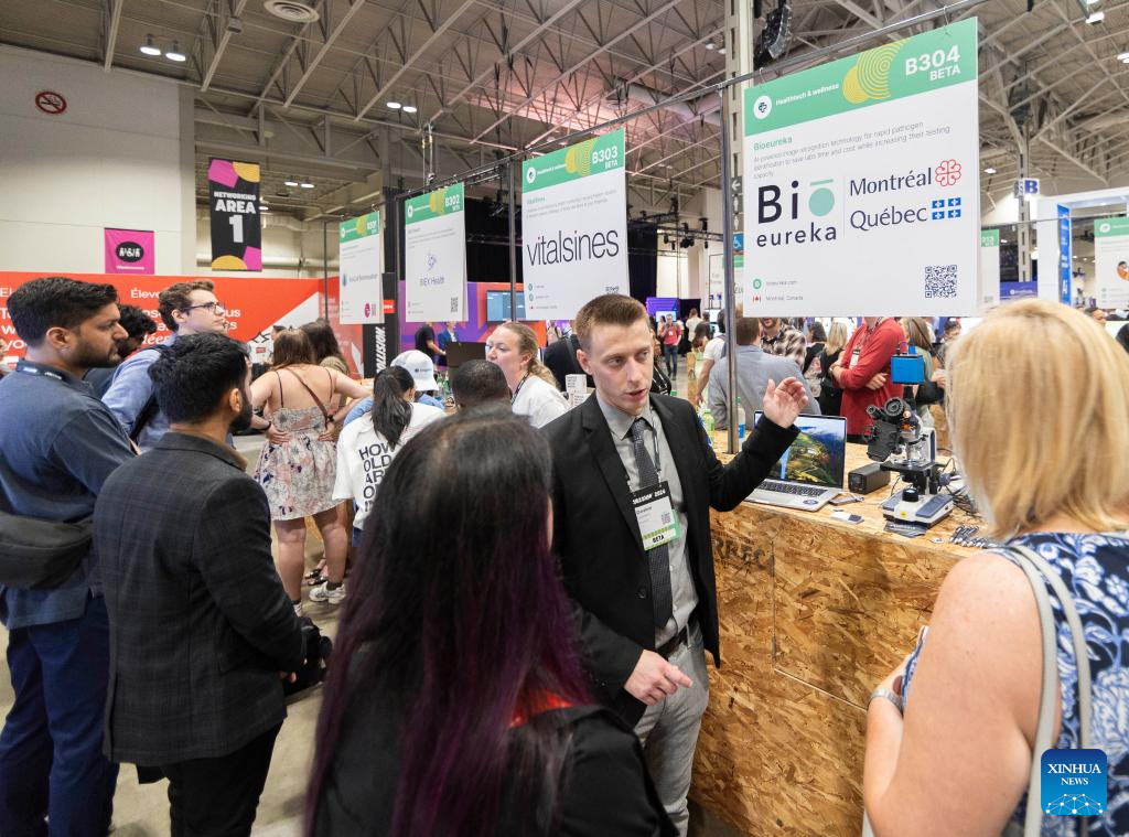 People visit start-ups' booths during the 2024 Collision Conference in Toronto, Canada, on June 18, 2024. The annual technology conference is held here from June 17 to June 20 this year with estimated 37,000 attendees from around the world. (Photo by Zou Zheng/Xinhua)