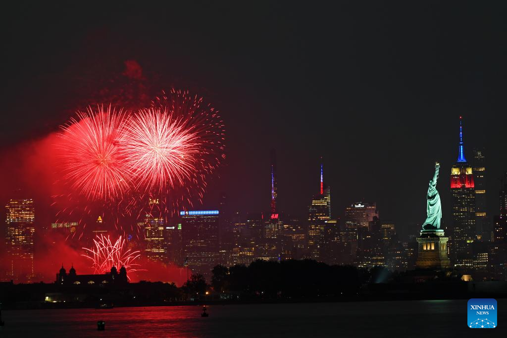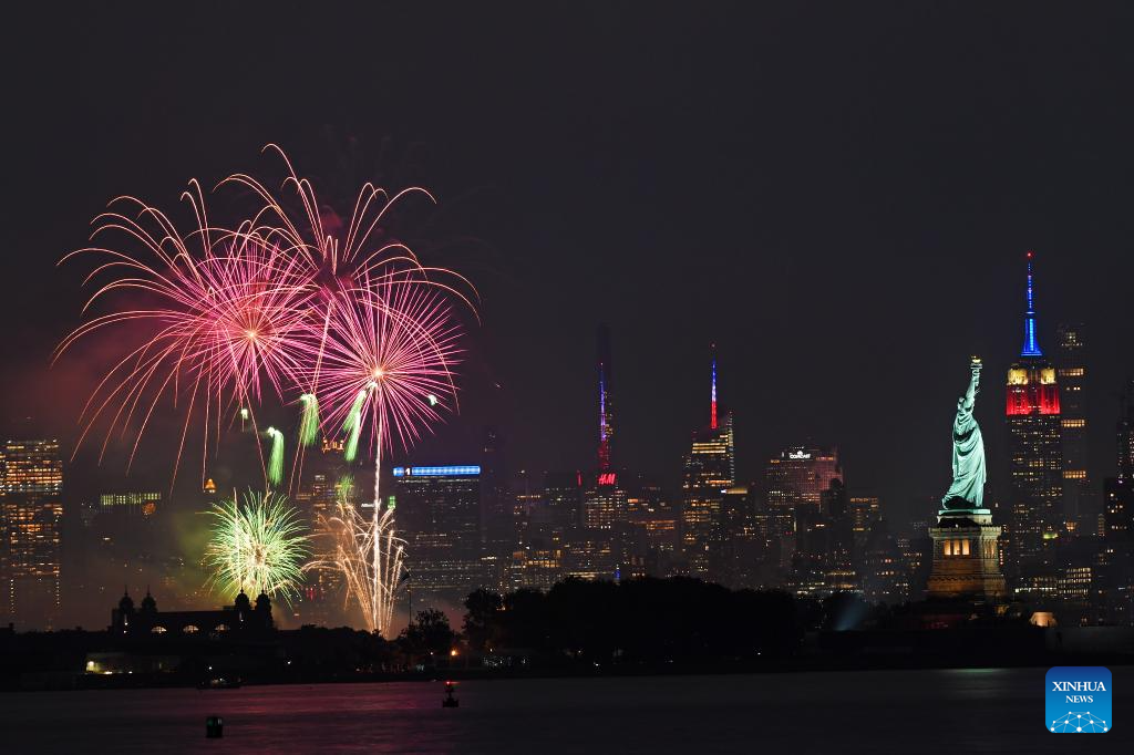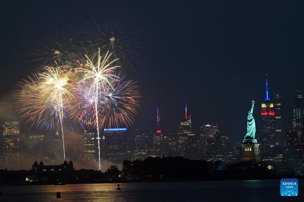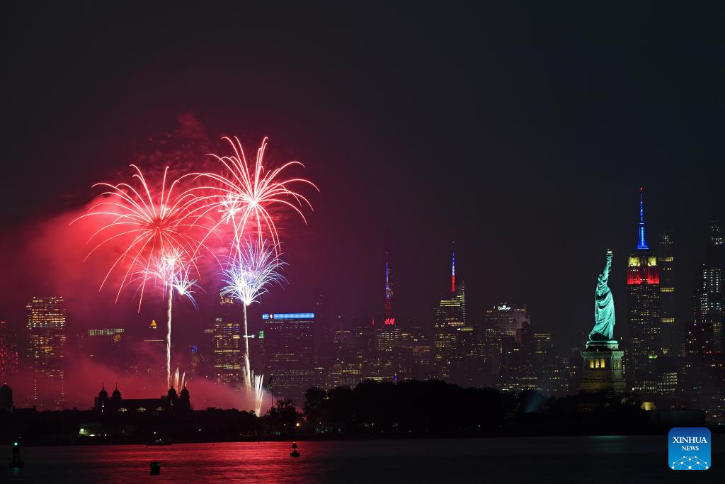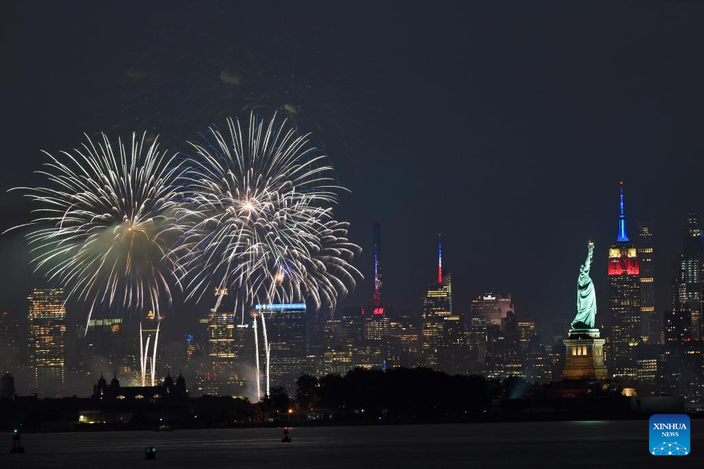 Fireworks explode over the Hudson River to celebrate Independence Day in New York, the United States, on July 4, 2024. (Xinhua/Li Rui)