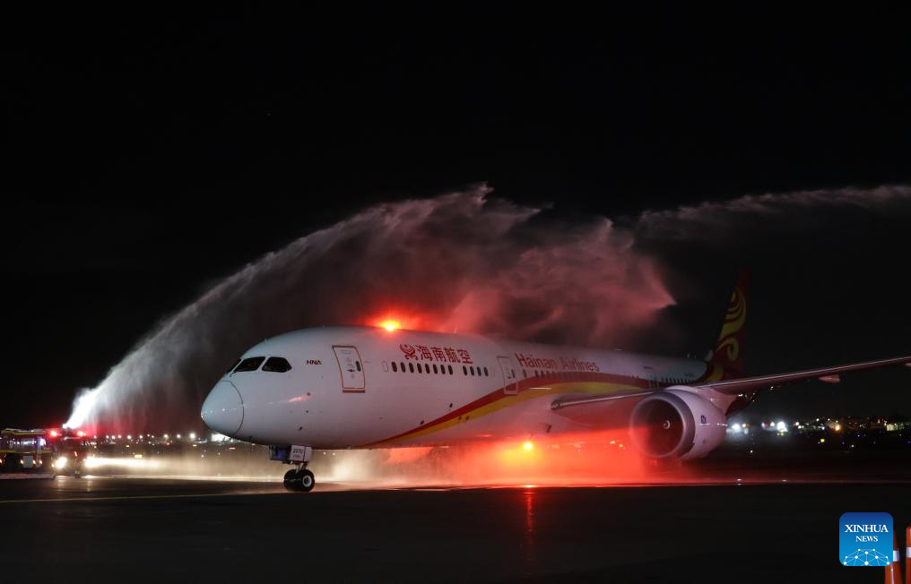 A passenger aircraft of China's Hainan Airlines passes a welcome water gate at the Benito Juarez International Airport in Mexico City, Mexico, July 13, 2024.