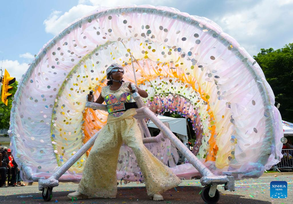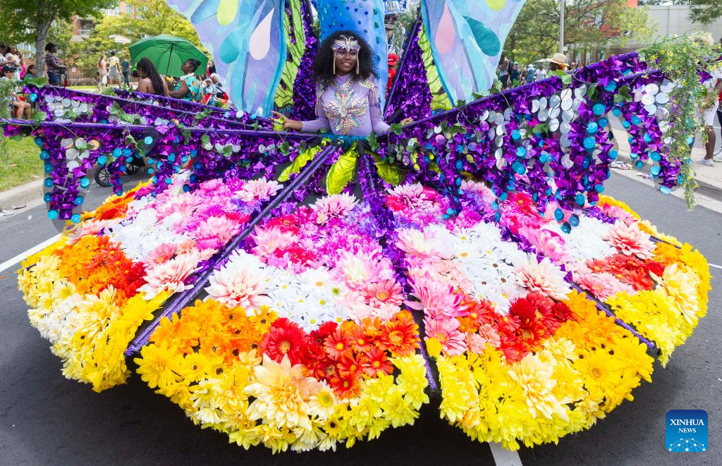A dressed-up girl dances with her float during the Junior Carnival Parade of the 2024 Toronto Caribbean Carnival in Toronto, Canada, on July 20, 2024. The annual event kicked off here on Saturday with thousands of young participants in vibrant costumes celebrating Caribbean culture with music and dance. (Photo by Zou Zheng/Xinhua)