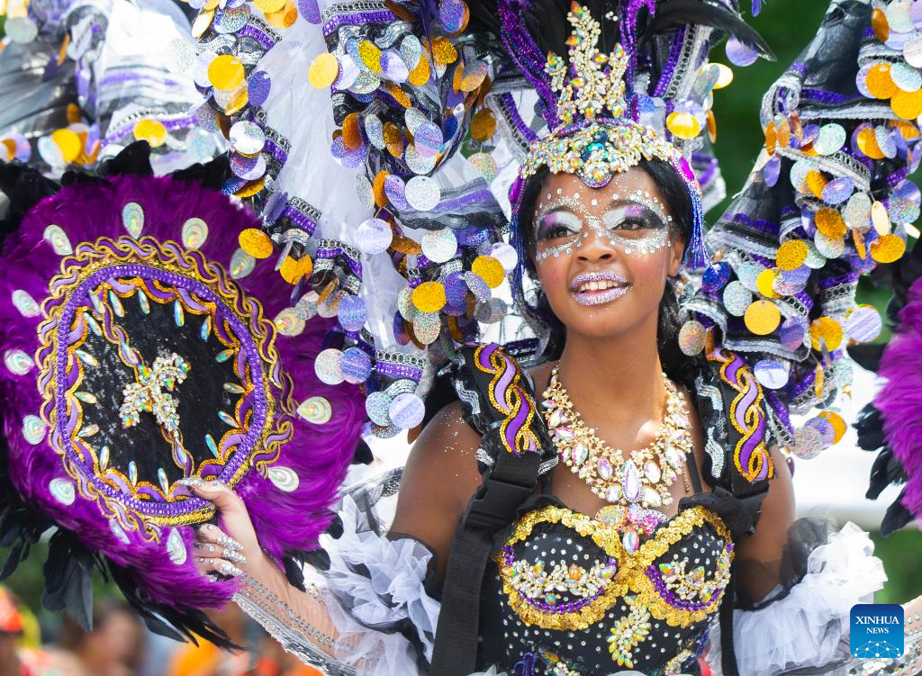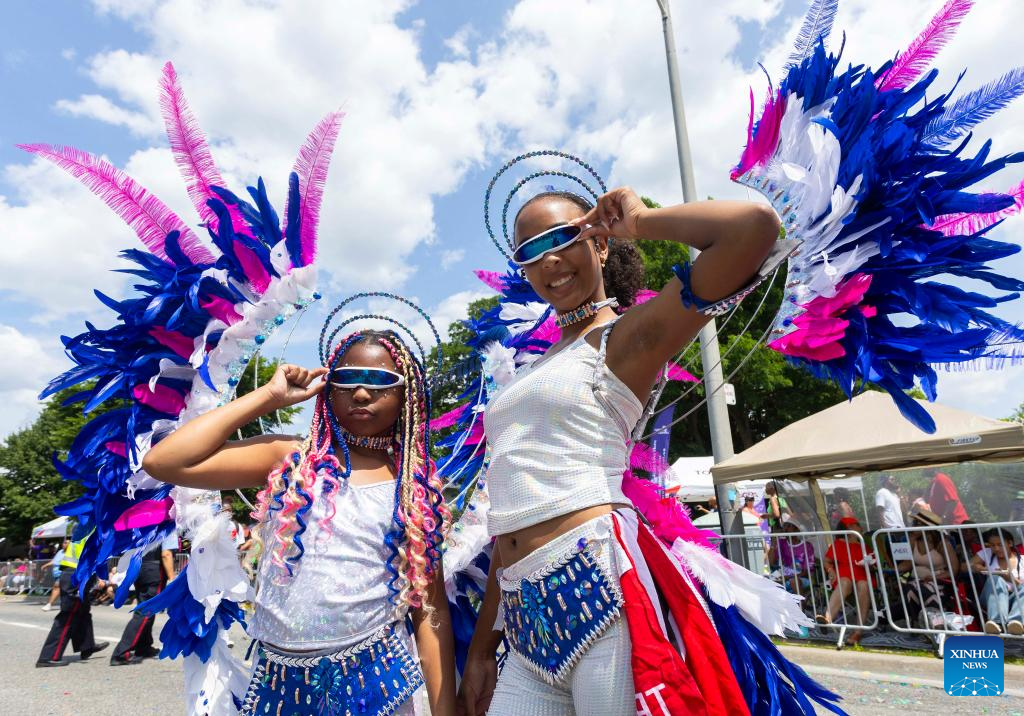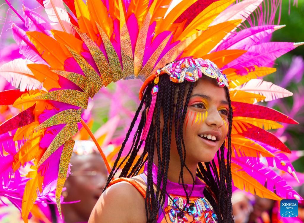 A dressed-up girl dances during the Junior Carnival Parade of the 2024 Toronto Caribbean Carnival in Toronto, Canada, on July 20, 2024. The annual event kicked off here on Saturday with thousands of young participants in vibrant costumes celebrating Caribbean culture with music and dance. (Photo by Zou Zheng/Xinhua)