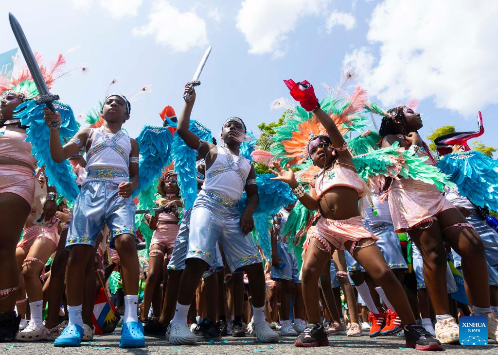 Dressed-up participants are pictured during the Junior Carnival Parade of the 2024 Toronto Caribbean Carnival in Toronto, Canada, on July 20, 2024. The annual event kicked off here on Saturday with thousands of young participants in vibrant costumes celebrating Caribbean culture with music and dance. (Photo by Zou Zheng/Xinhua)
