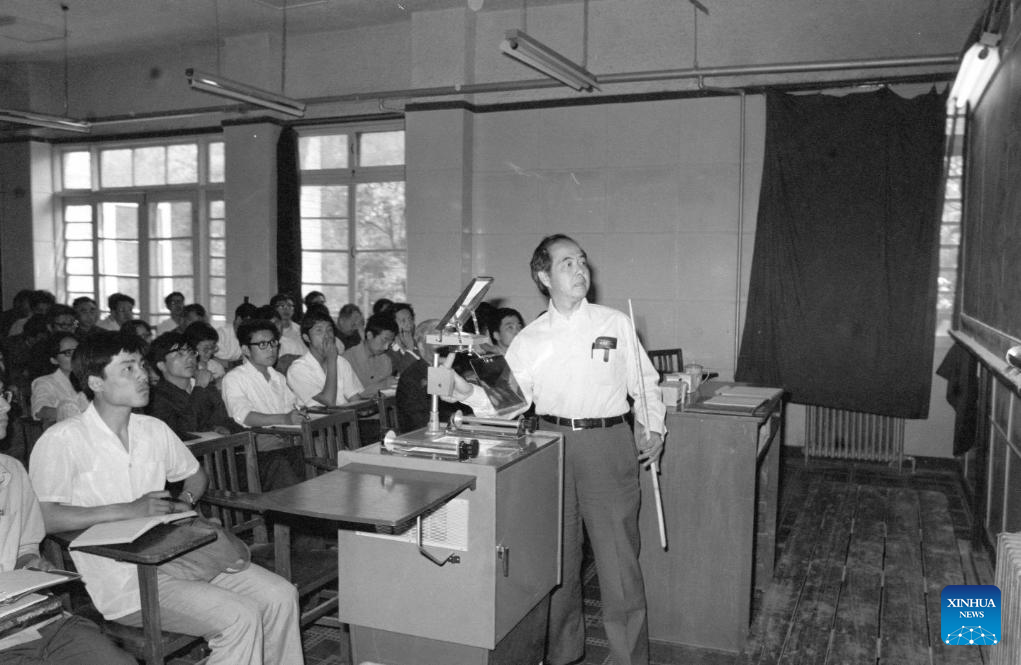 This file photo taken on May 18, 1984 shows Tsung-Dao Lee (1st R) making an academic report at University of Science and Technology of China. Chinese-American physicist Tsung-Dao Lee died Sunday in San Francisco, California, confirmed by the Tsung-Dao Lee Institute at Shanghai Jiao Tong University and China Center for Advanced Science and Technology.