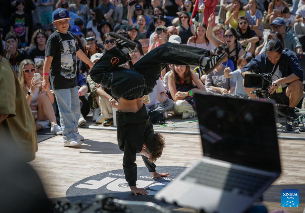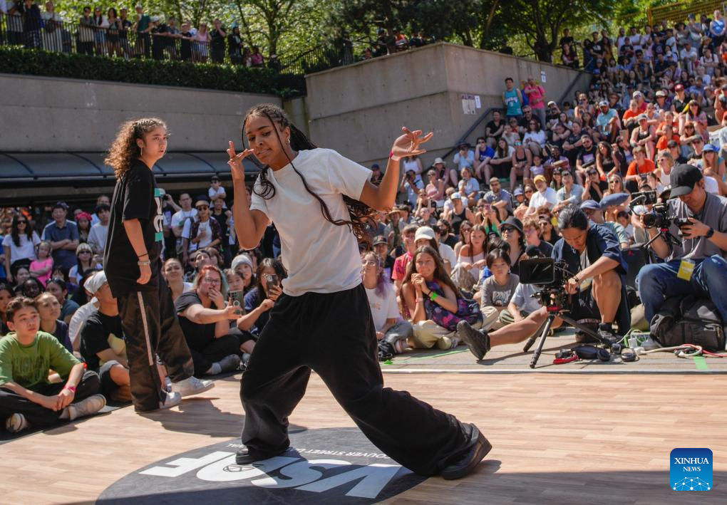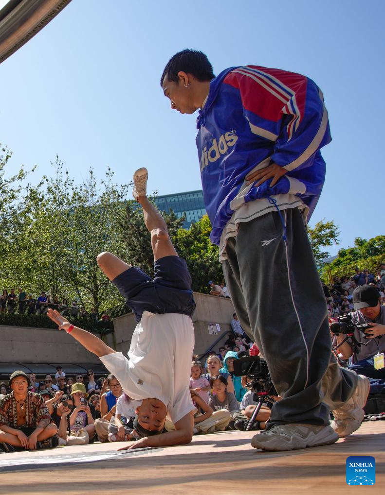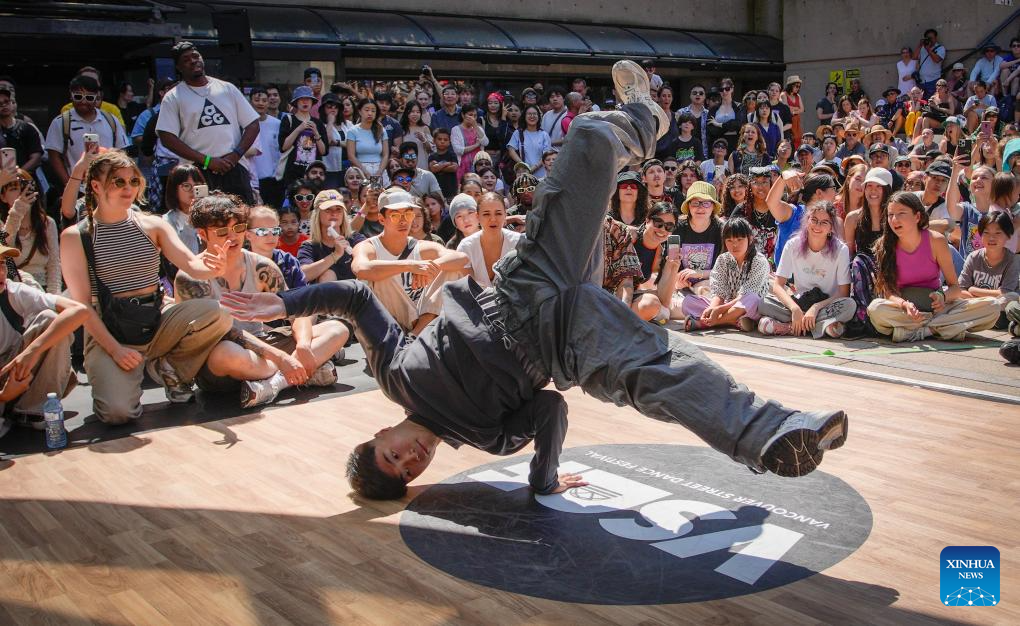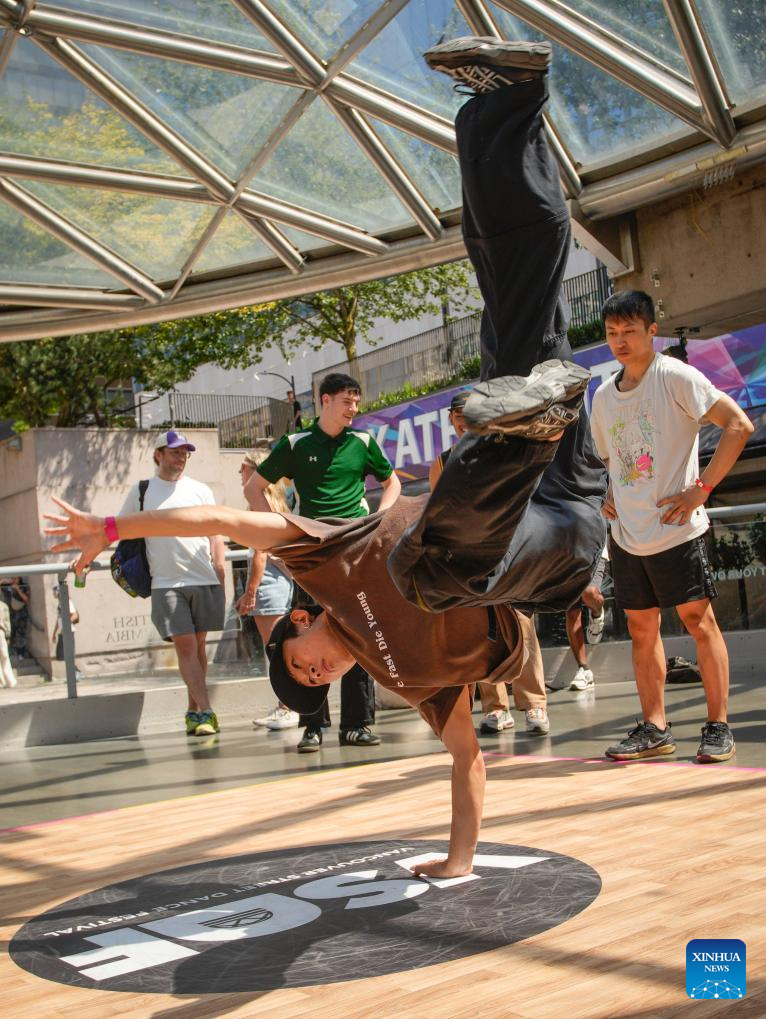 Dancers perform during the 2024 Vancouver Street Dance Festival at Robson Square in Vancouver, British Columbia, Canada, Aug. 5, 2024. Dancers from around the world showcased various street dance styles through dance battles, performances, and workshops. (Photo by Liang Sen/Xinhua)