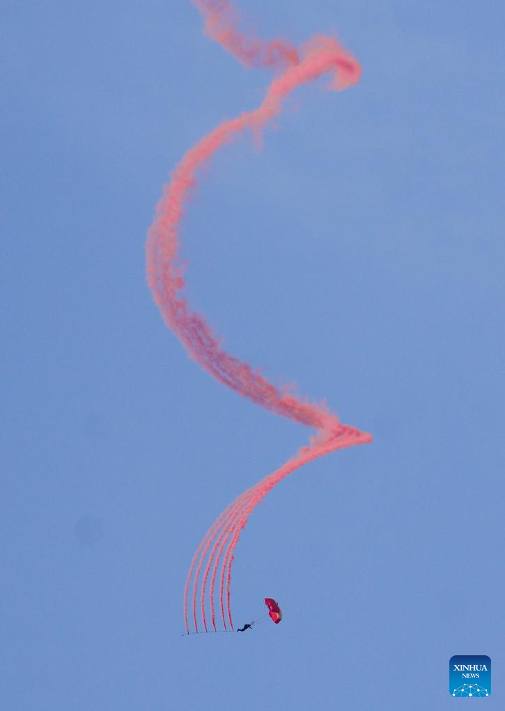 A member of the Canadian Armed Forces Parachute Team, the SkyHawks, performs during the 2024 Abbotsford International Airshow in Abbotsford, Canada, Aug. 9, 2024.