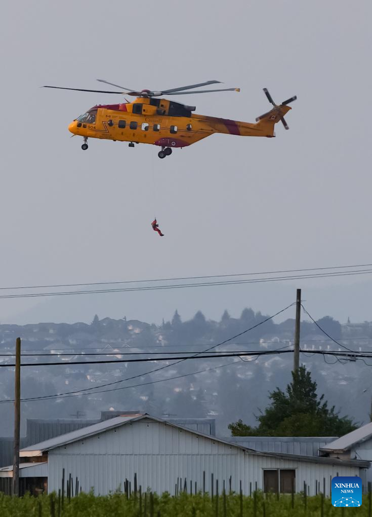 A CH-149 Cormorant helicopter performs a rescue demonstration during the 2024 Abbotsford International Airshow in Abbotsford, Canada, Aug. 9, 2024.