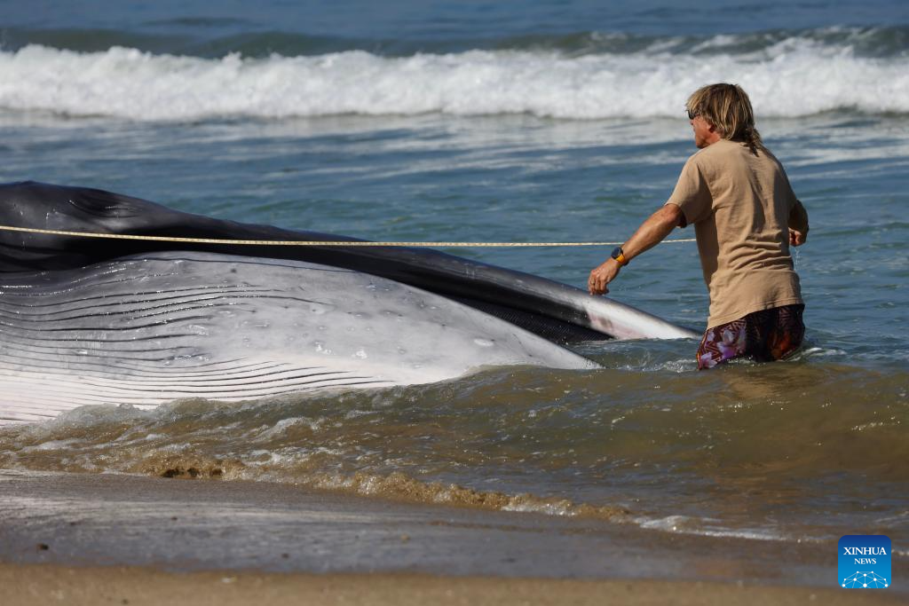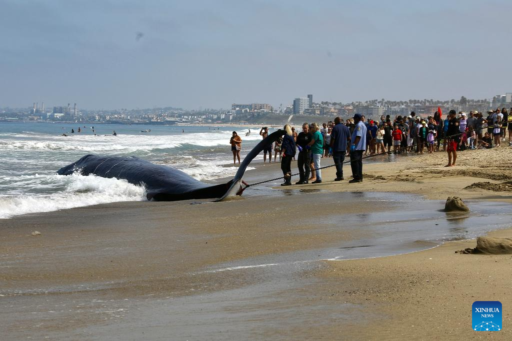 Wildlife specialists try to determine the cause of death of a fin whale washed ashore at Torrance Beach, Los Angeles County, California, the United States on Aug. 11, 2024. The 51-foot-long (about 15.5-meter-long) dead fin whale, washed ashore Saturday evening, died before rescuers could arrive. (Photo by Qiu Chen/Xinhua)