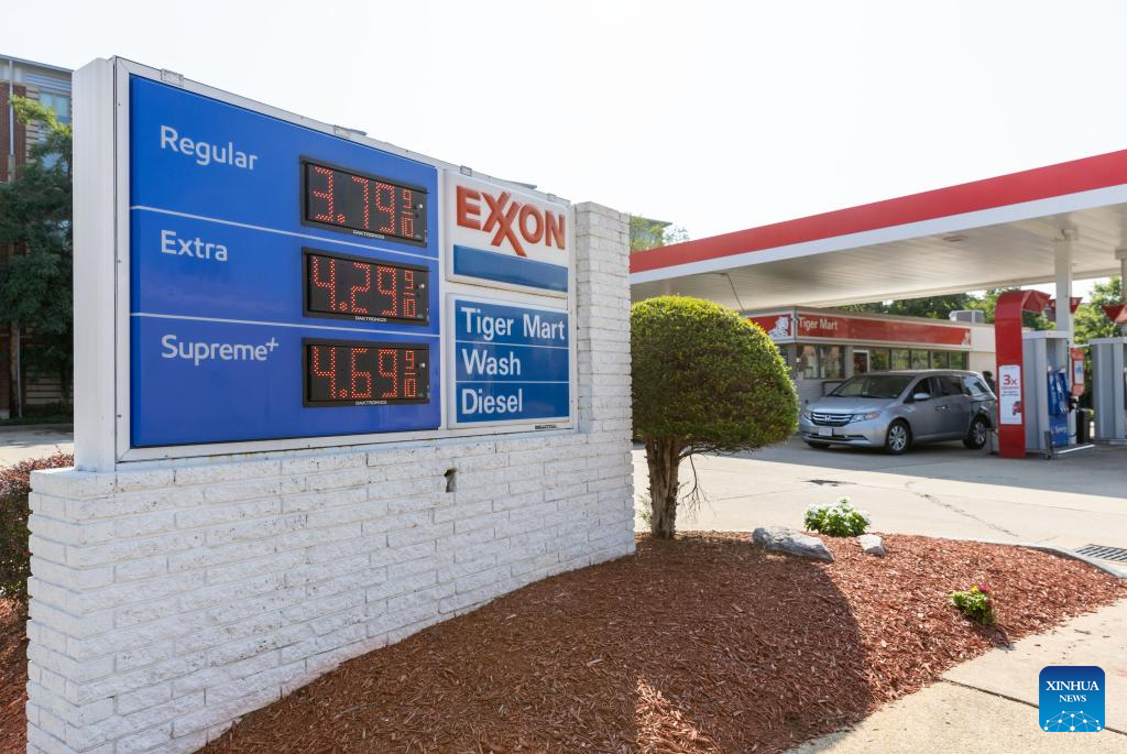 This photo taken on Aug. 14, 2024 shows a gas station in Arlington, Virginia, the United States. U.S. consumer inflation in July increased 2.9 percent from a year ago, after climbing 3.0 percent in June and 3.3 percent in May, the U.S. Labor Department reported Wednesday. (Xinhua/Hu Yousong)