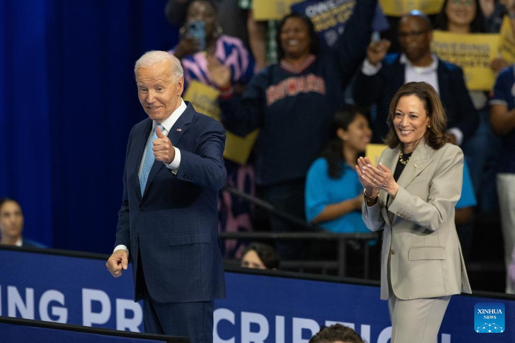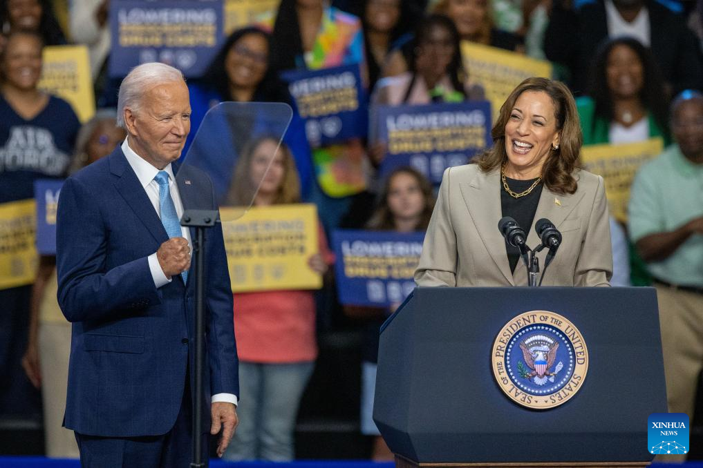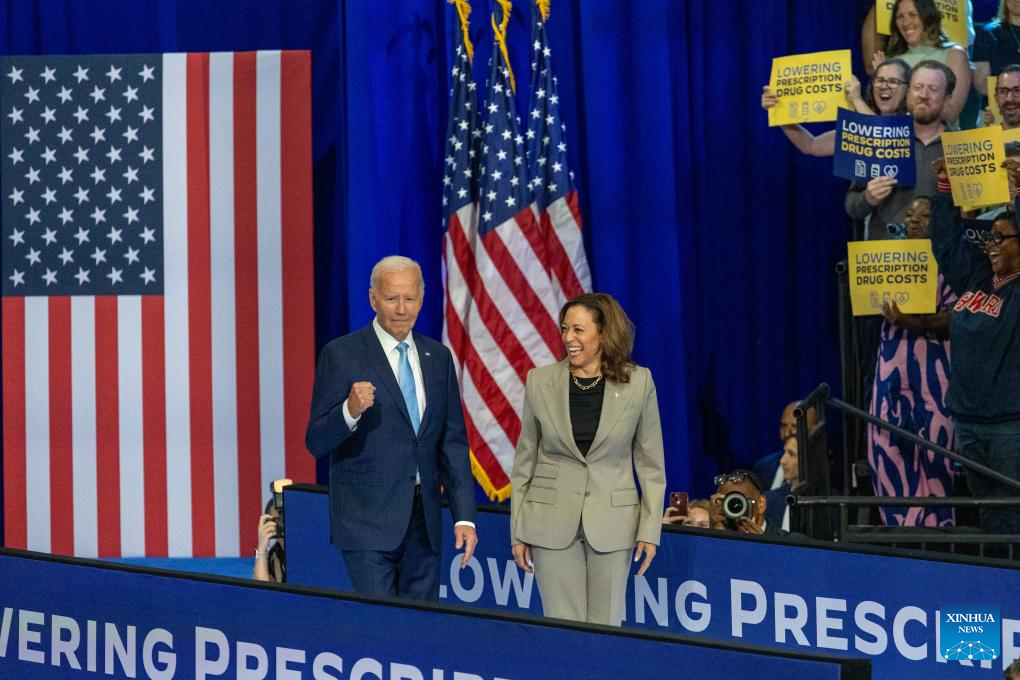 U.S. President Joe Biden (L) and Vice President Kamala Harris enter the stage during an event where they highlighted the administration's efforts to lower prescription drug costs in Prince George's County, Maryland, the United States, Aug. 15, 2024. The Biden administration said on Thursday that drug price negotiations will knock hundreds of dollars, in some cases thousands, off the list prices of 10 of Medicare's most popular and costliest drugs. (Xinhua/Hu Yousong)
