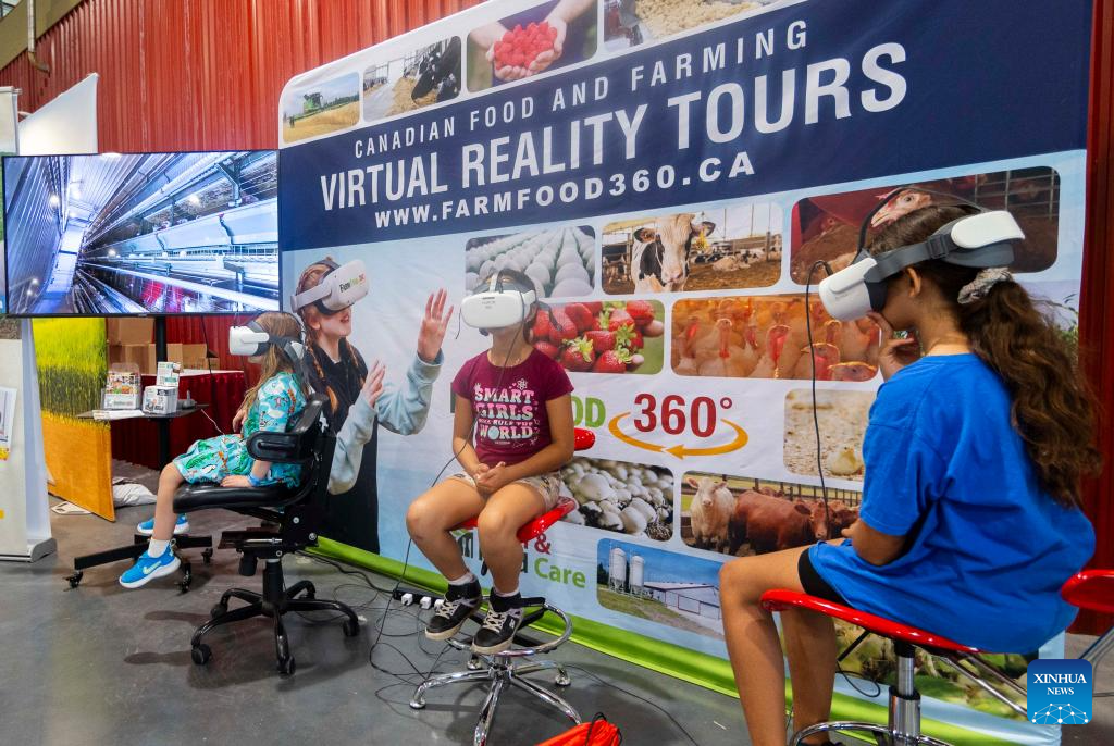 Children try on VR glasses to experience a virtual reality tour of Canadian food and farming at the 2024 Canadian National Exhibition (CNE) in Toronto, Canada, on Aug. 16, 2024. As one of the largest community events in Canada, the annual 18-day event kicked off here on Friday. (Photo by Zou Zheng/Xinhua)