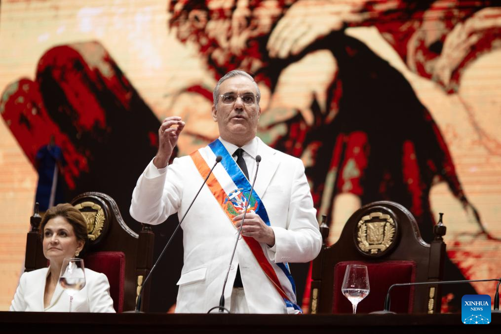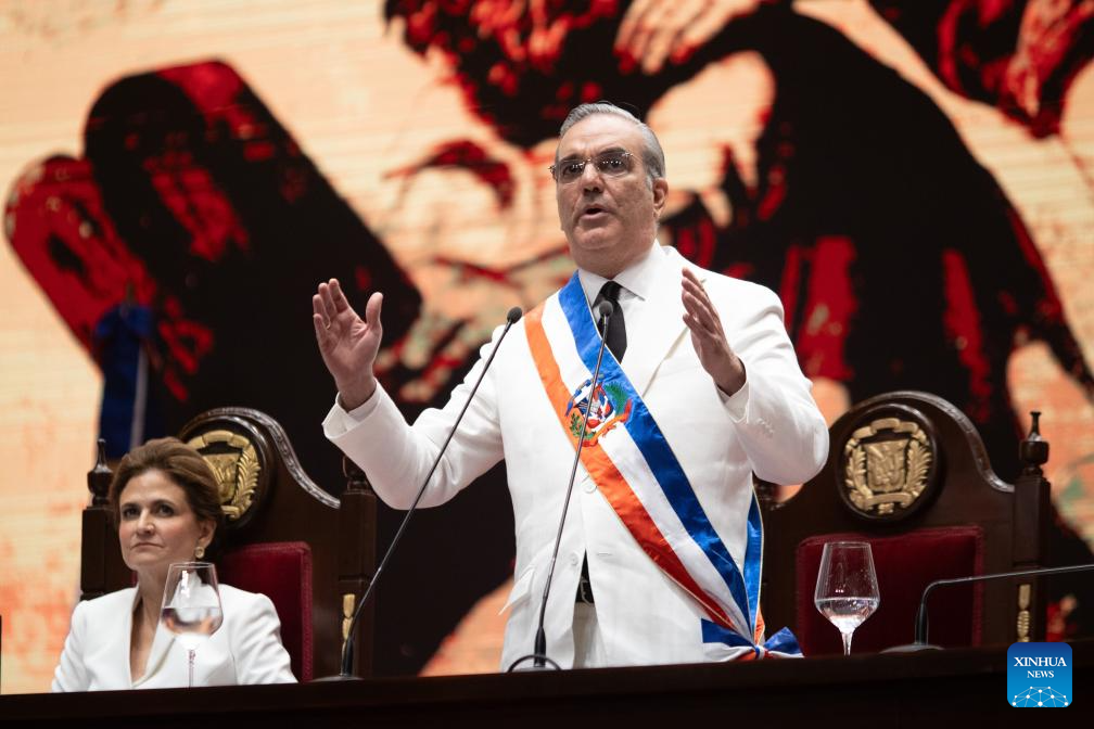 President of the Dominican Republic Luis Abinader (R) addresses during his second-term inauguration in Santo Domingo, Dominican Republic, Aug. 16, 2024. (Xinhua/Li Muzi)