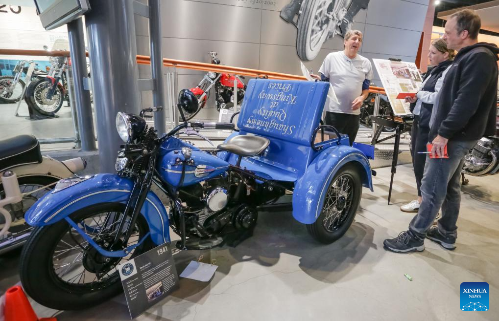 People take a look at a 1941 Harley-Davidson Servi-Car three-wheeled motorcycle during the 13th annual Vintage Motorcycle Show and Shine event in Vancouver, British Columbia, Canada, Aug. 24, 2024. (Photo by Liang Sen/Xinhua)