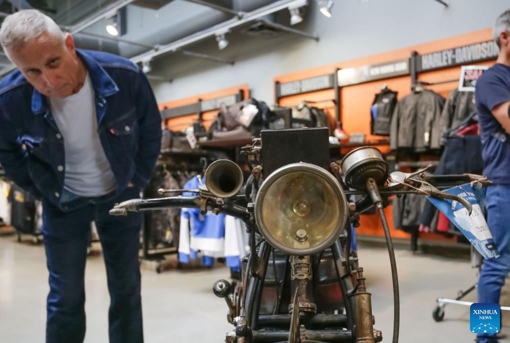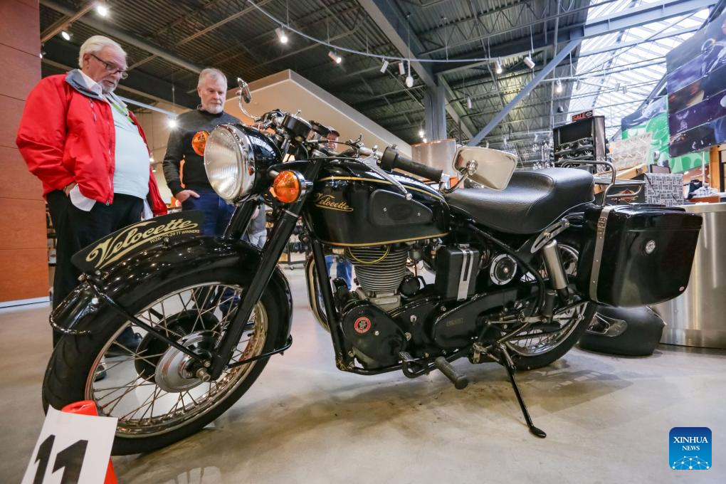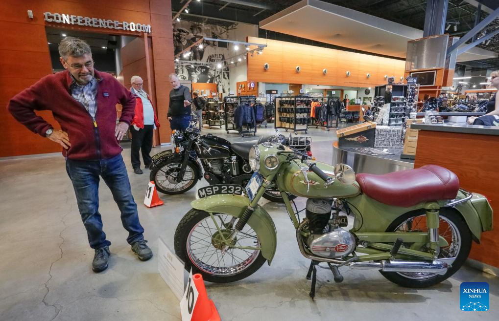 People look at vintage motorcycles during the 13th annual Vintage Motorcycle Show and Shine event in Vancouver, British Columbia, Canada, Aug. 24, 2024. (Photo by Liang Sen/Xinhua)