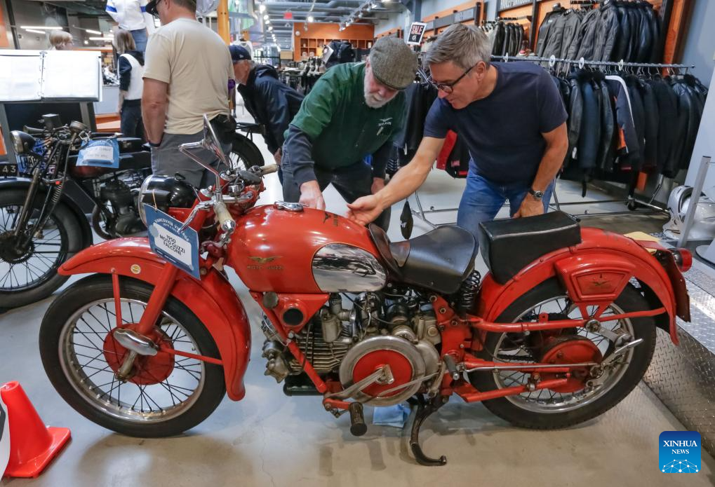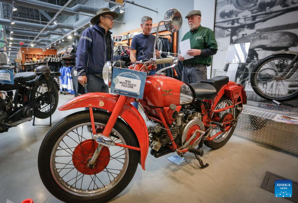 People take a look at a 1950 Moto Guzzi Falcone motorcycle during the 13th annual Vintage Motorcycle Show and Shine event in Vancouver, British Columbia, Canada, Aug. 24, 2024. (Photo by Liang Sen/Xinhua)