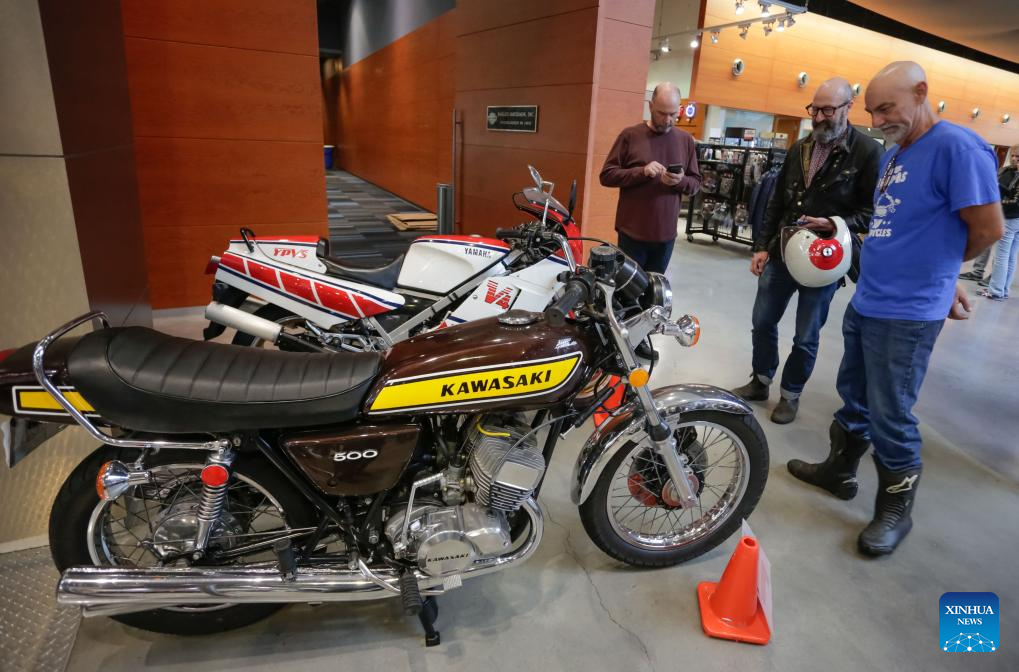 A 1973 Kawasaki motorcycle is displayed during the 13th annual Vintage Motorcycle Show and Shine event in Vancouver, British Columbia, Canada, Aug. 24, 2024. (Photo by Liang Sen/Xinhua)