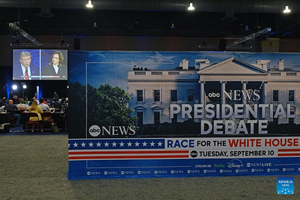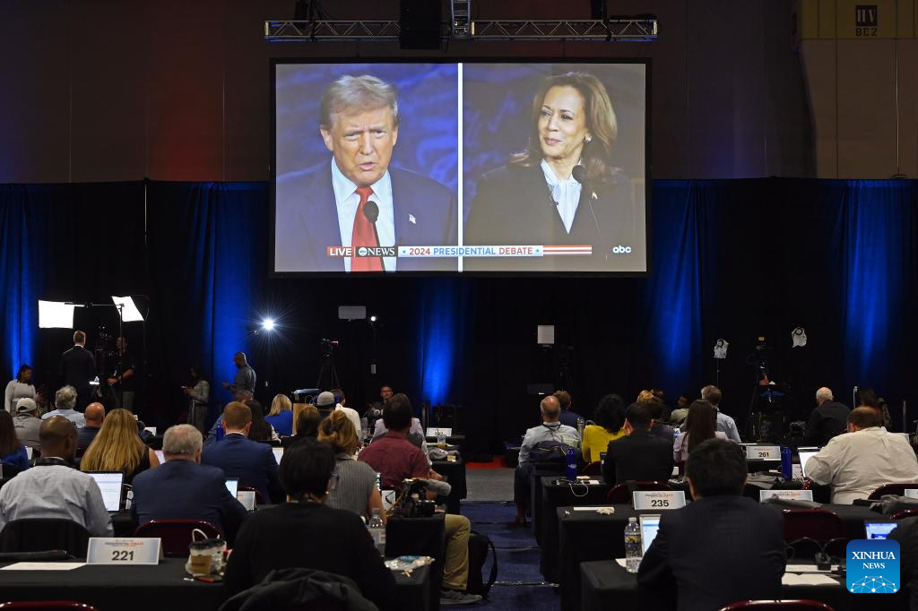 This photo taken at the U.S. presidential debate media filing center on Sept. 10, 2024 shows U.S. Vice President Kamala Harris (R) and former President Donald Trump during a presidential debate in Philadelphia, the United States. Harris and Trump faced off for the first time Tuesday night in a 2024 U.S. presidential debate in the city of Philadelphia. (Xinhua/Li Rui)