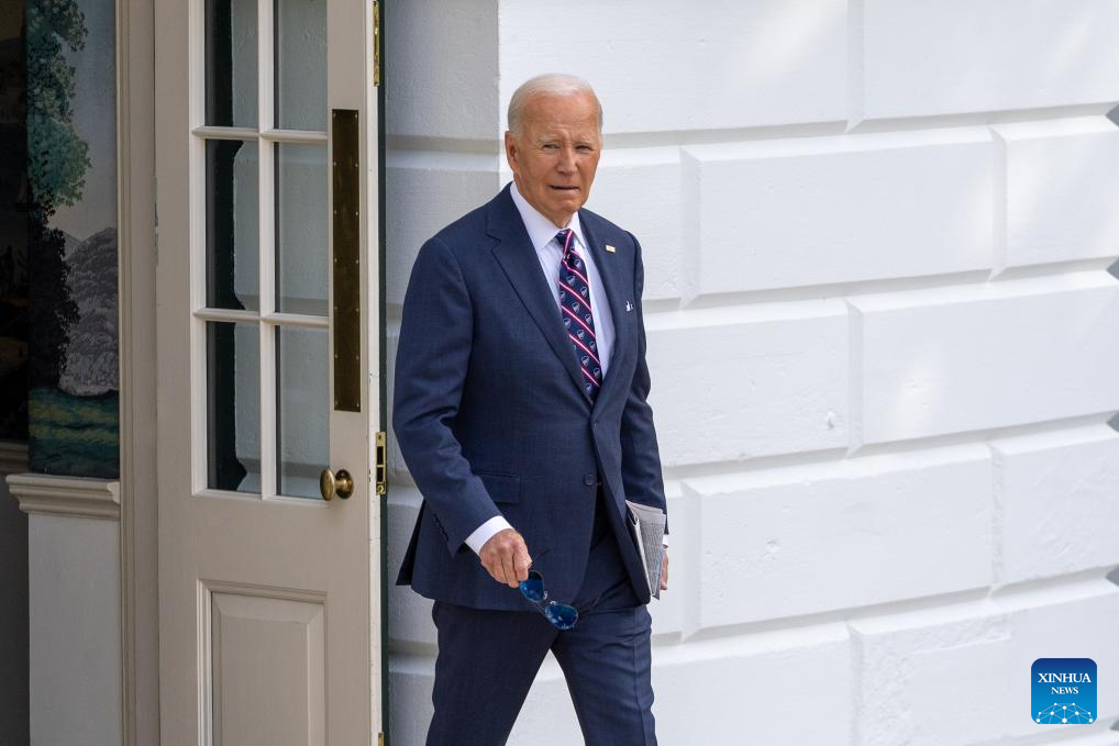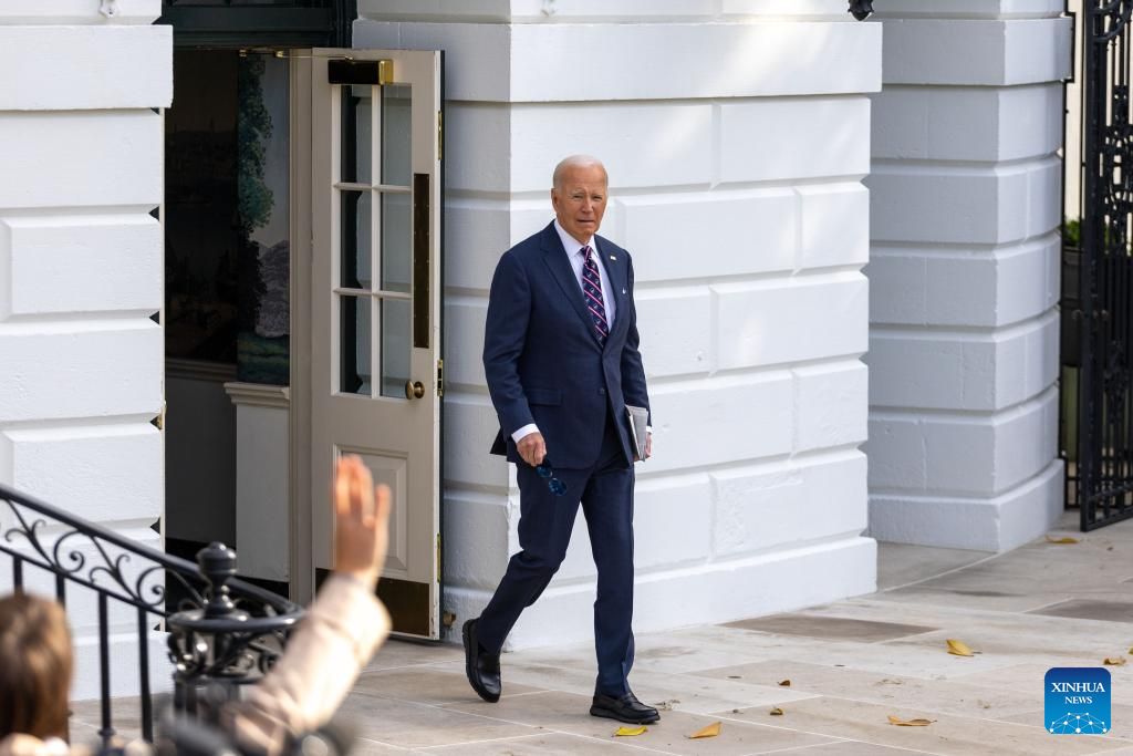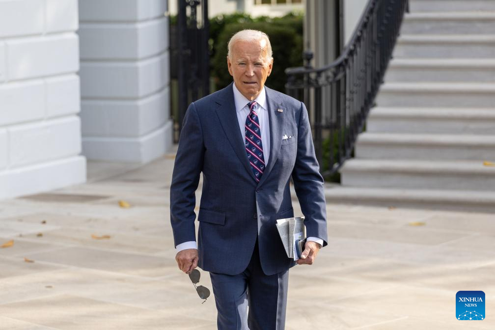 U.S. President Joe Biden heads towards the press to speak before boarding Marine One at the White House in Washington, D.C., the United States, Sept. 16, 2024. (Xinhua/Hu Yousong)