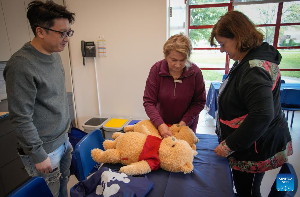A "doll doctor" checks a stuffed toy during the Teddy Bear Repair Fair in Richmond, British Columbia, Canada, Sept. 21, 2024.