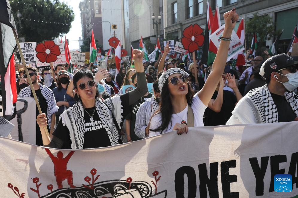 LOS ANGELES, Oct. 6 (Xinhua) -- Roughly a thousand pro-Palestinian protestors packed Pershing Square in downtown Los Angeles on Saturday, their chants echoing through the streets as the first anniversary of Oct. 7, 2023 approaches, a date marking the start of the ongoing Israeli-Palestinian conflict.
